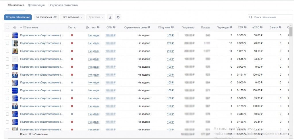 Было составлено 171 объявление. На каждую аудиторию давали по несколько вариантов объявлений, смотрели какое лучше отрабатывает по CPC, CTR и конверсии в переходы на сайт. Всего было запущено 12 аудиторий. Посты составляли основываясь на технологию мотивации по Шугерману.