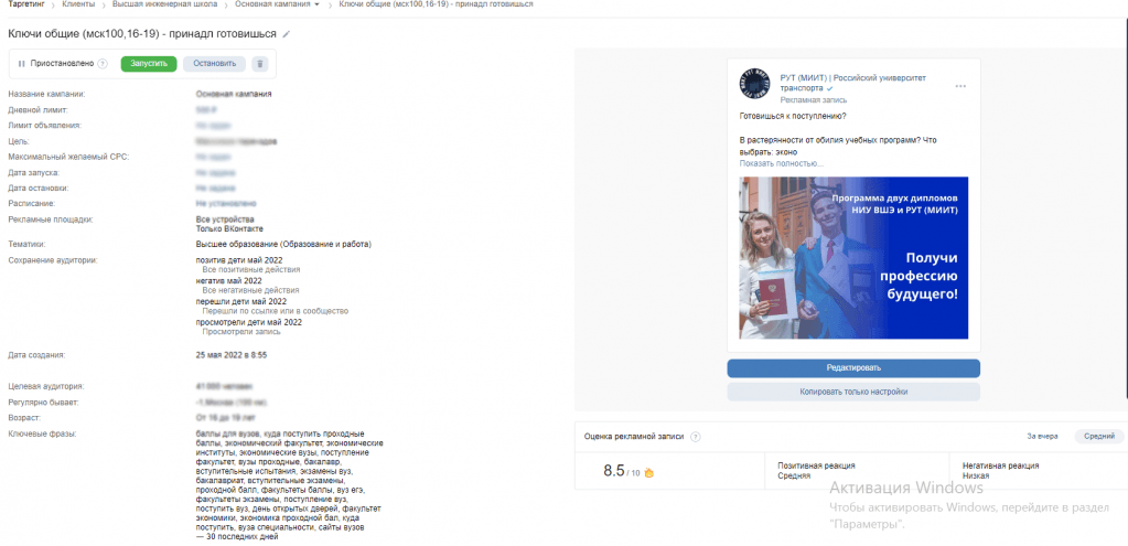 * На основе аналитики перешли на этап запуска рекламы Вконтакте. Начали с тестовой кампании. В ходе теста выявили 14 самых конверсионных объявлений и перенесли их в основную кампанию.