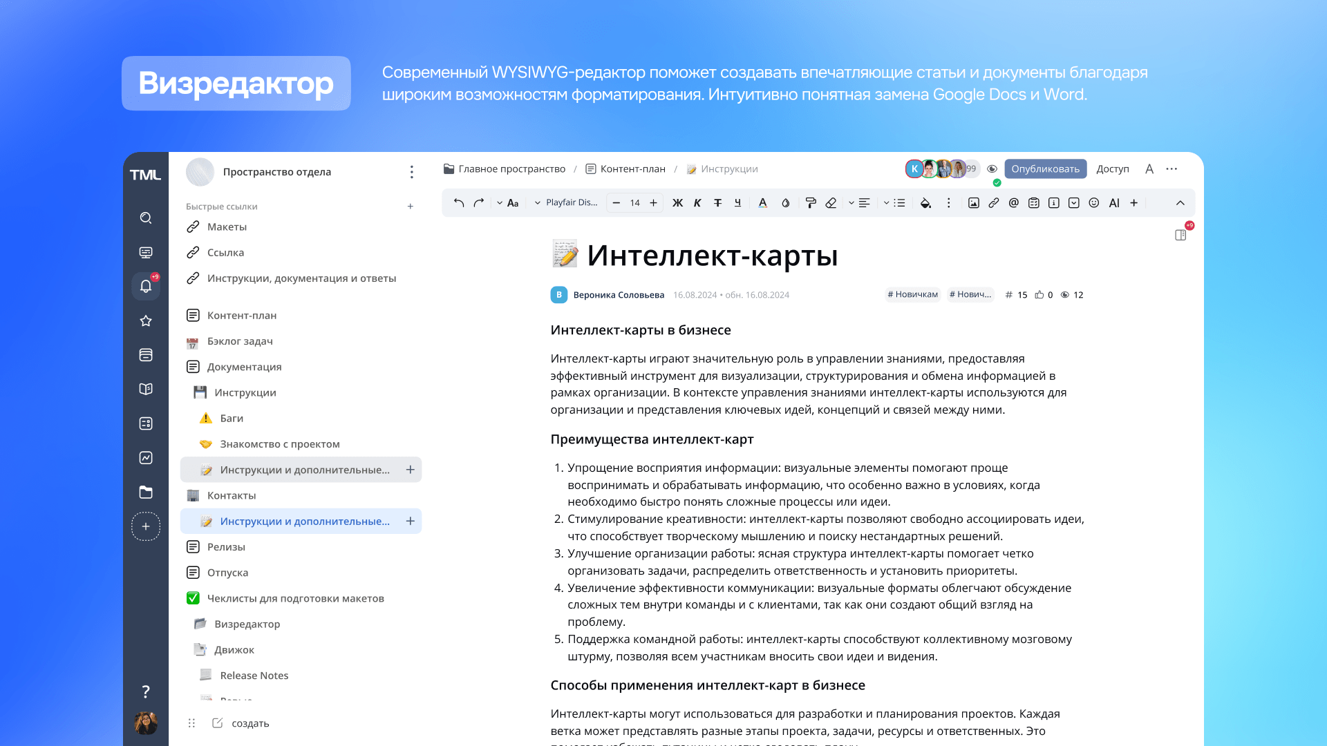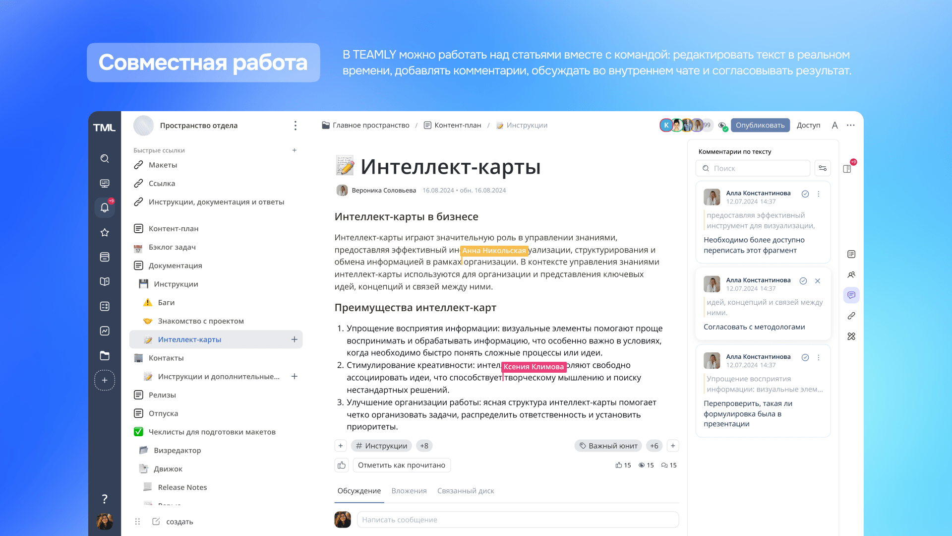 - Упоминание (@) сотрудников в статье, постановка задач и дедлайнов.