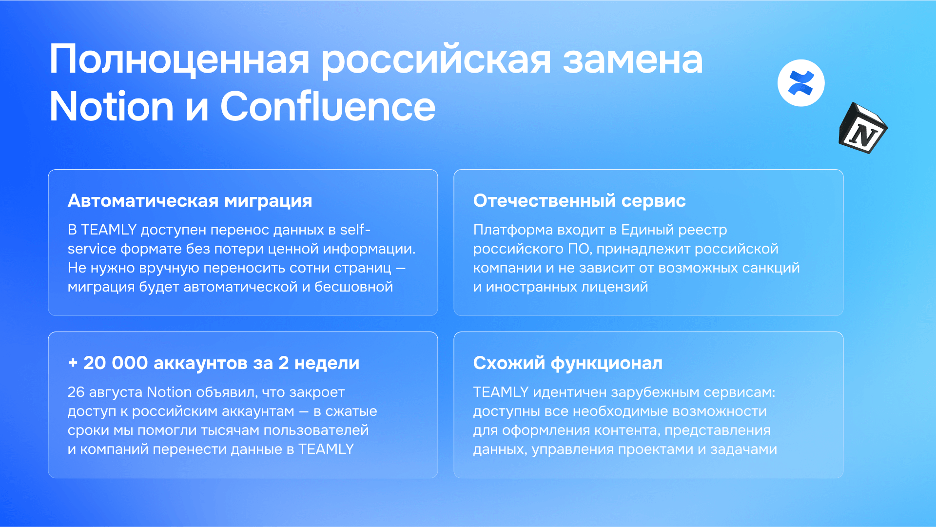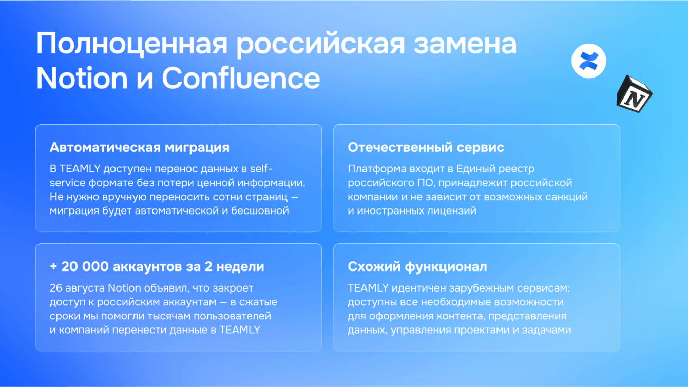 2. Само создание платформы TEAMLY было сосредоточено на решении ключевой бизнес-задачи — обеспечении импортозамещения западных сервисов систем управления знаниями. Уход Confluence, Notion и аналогичных зарубежных платформ стал стимулом для создания надежного отечественного решения.
