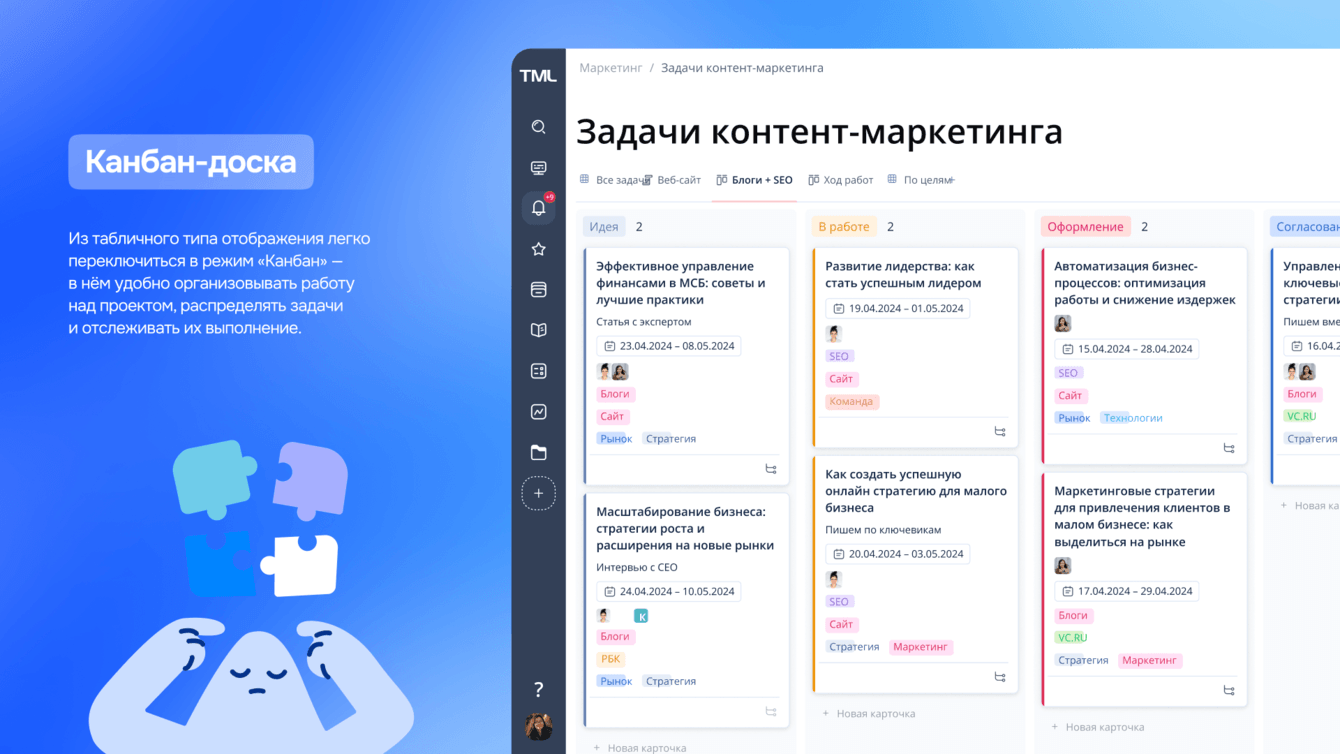 В Умных таблицах можно отфильтровать данные, настроить связи или перейти в карточку с подробным описанием задачи. При этом таблицу с отфильтрованными данными можно вставить в статью как виджет. Из табличного типа отображения можно переключиться на канбан — в нём удобно отслеживать этапы процесса и статусы по задаче.