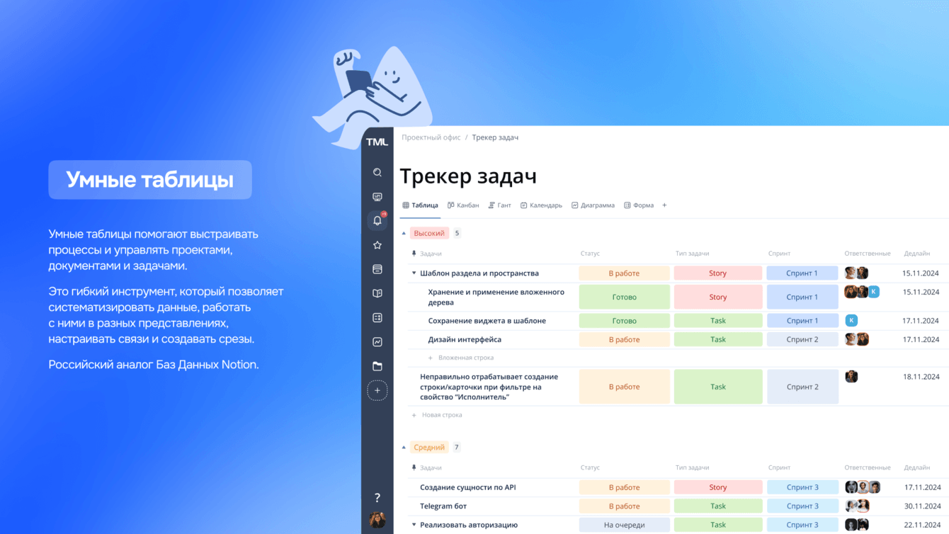 В TEAMLY доступны все те же представления данных: Таблица с фильтрами и сортировкой, Канбан-доски для управления задачами, Гант для планирования сроков и Календарь для отслеживания событий.