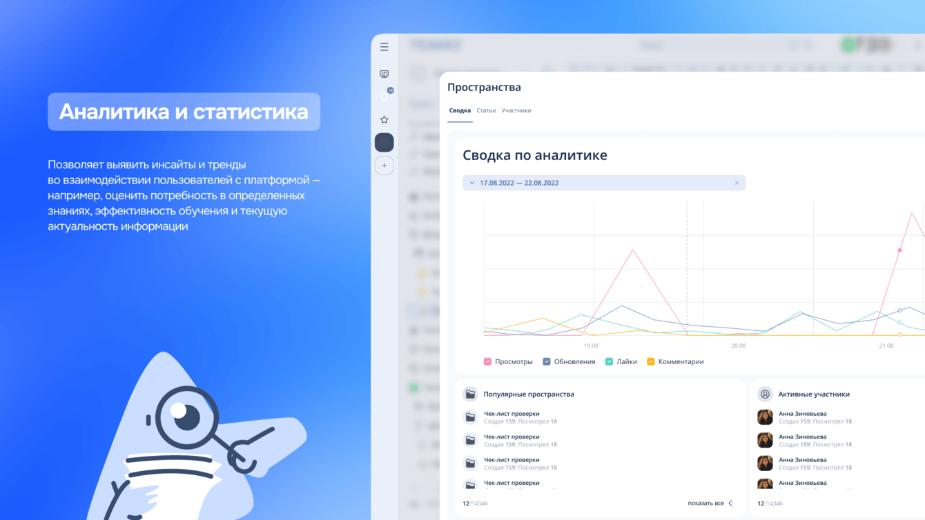 - Аналитика по пространствам и статьям: просмотры, обновления, лайки и комментарии;