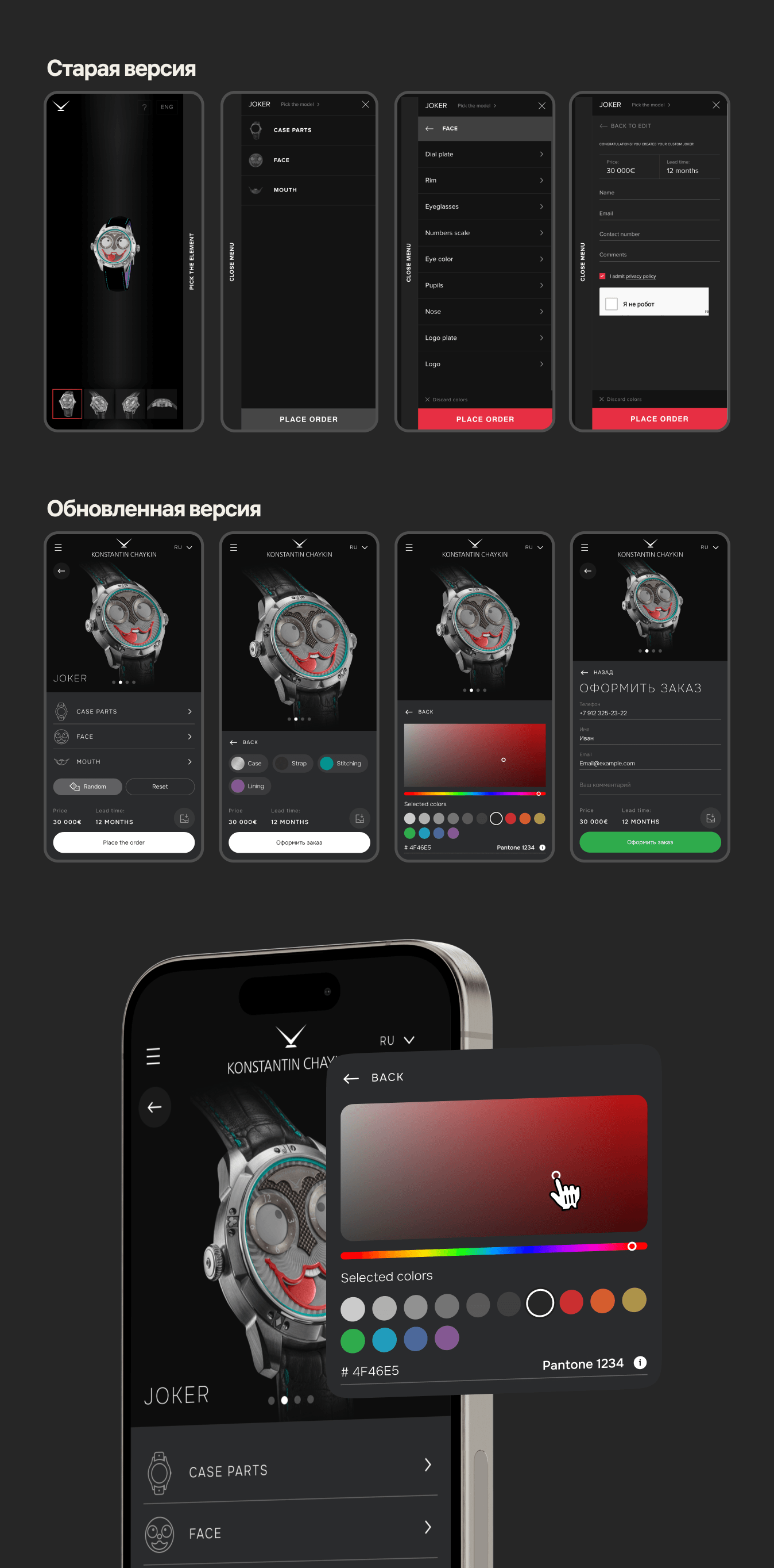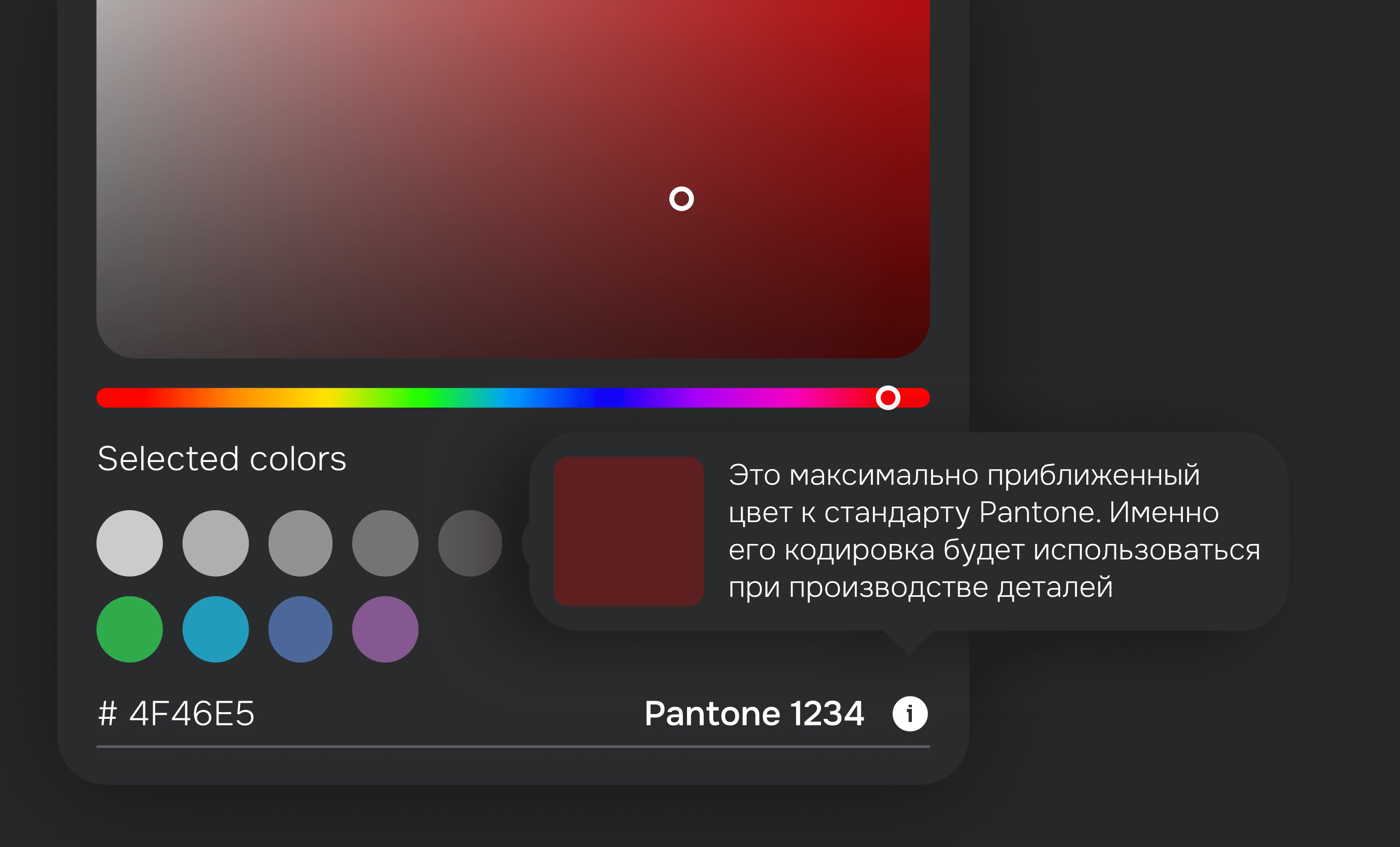 Также обратная связь от пользователей и опыт бренда говорили о том, что кодировка цвета в HEX не используется на производстве и не так широко известна покупателем часов. В этой сфере превалирует палитра Pantone. Поэтому в пользовательские сценарии мы добавили вывод цвета в формате Pantone – он должен автоматически конвертироваться из HEX.