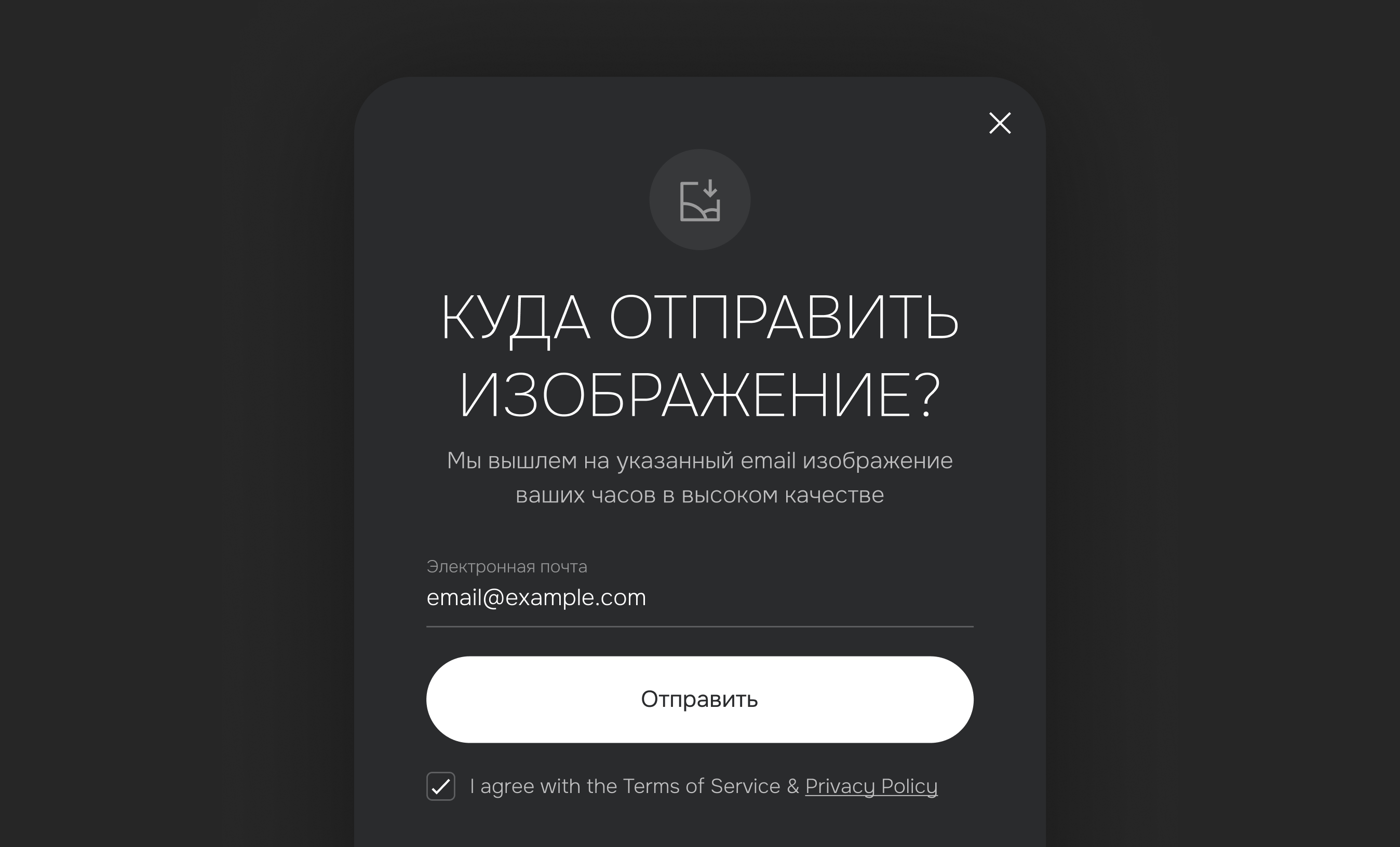 Когда пользователь генерирует дизайн часов, вероятно, он просто перебирает разные варианты, либо подбирает нужные оттенки и материалы для своей второй половинки, чтобы узнать, хочет ли она такие часы в подарок. Поэтому важно давать возможность скачать картинку без обязательства сразу оформлять заказ, а компания-производитель за это попросит e-mail пользователя.