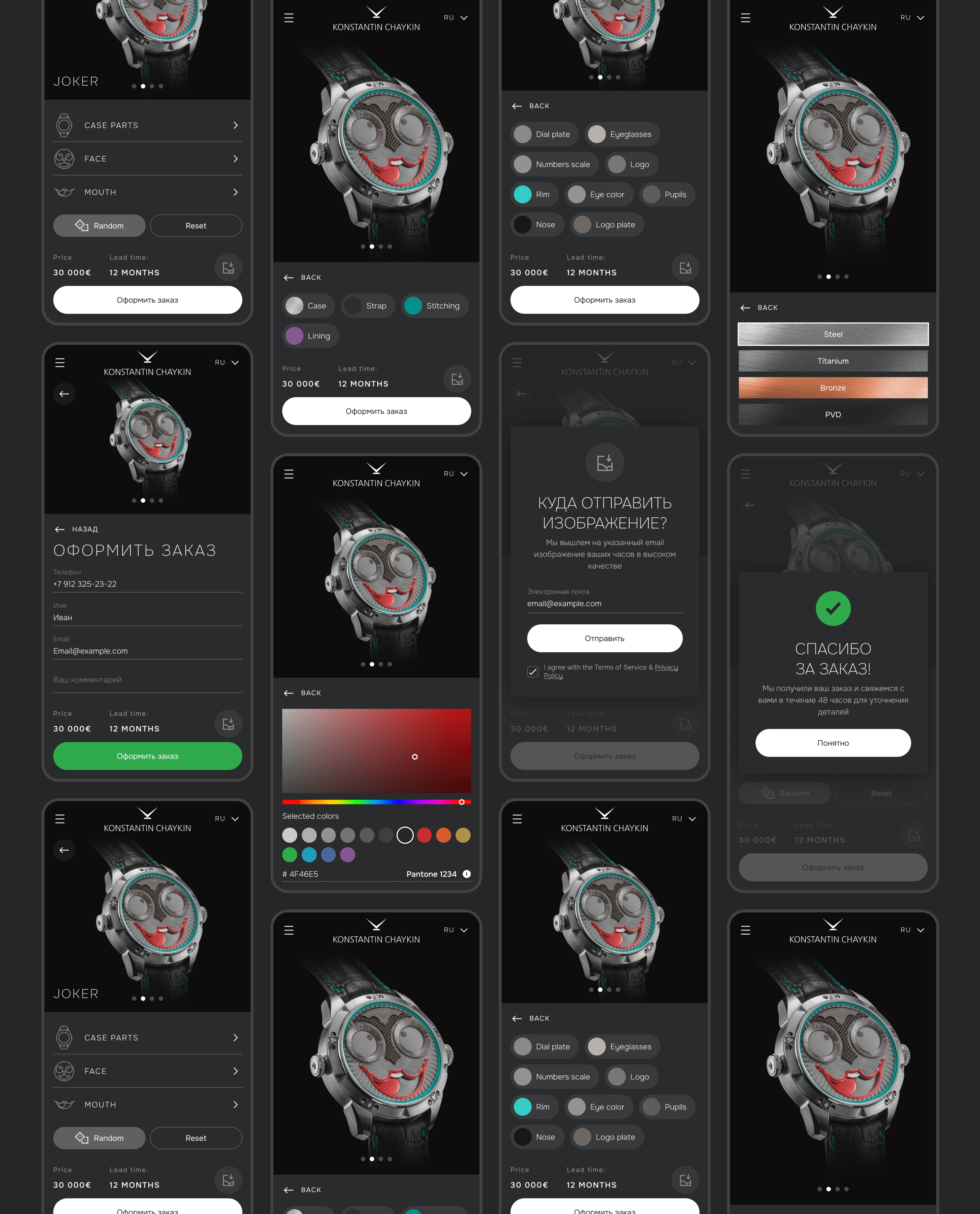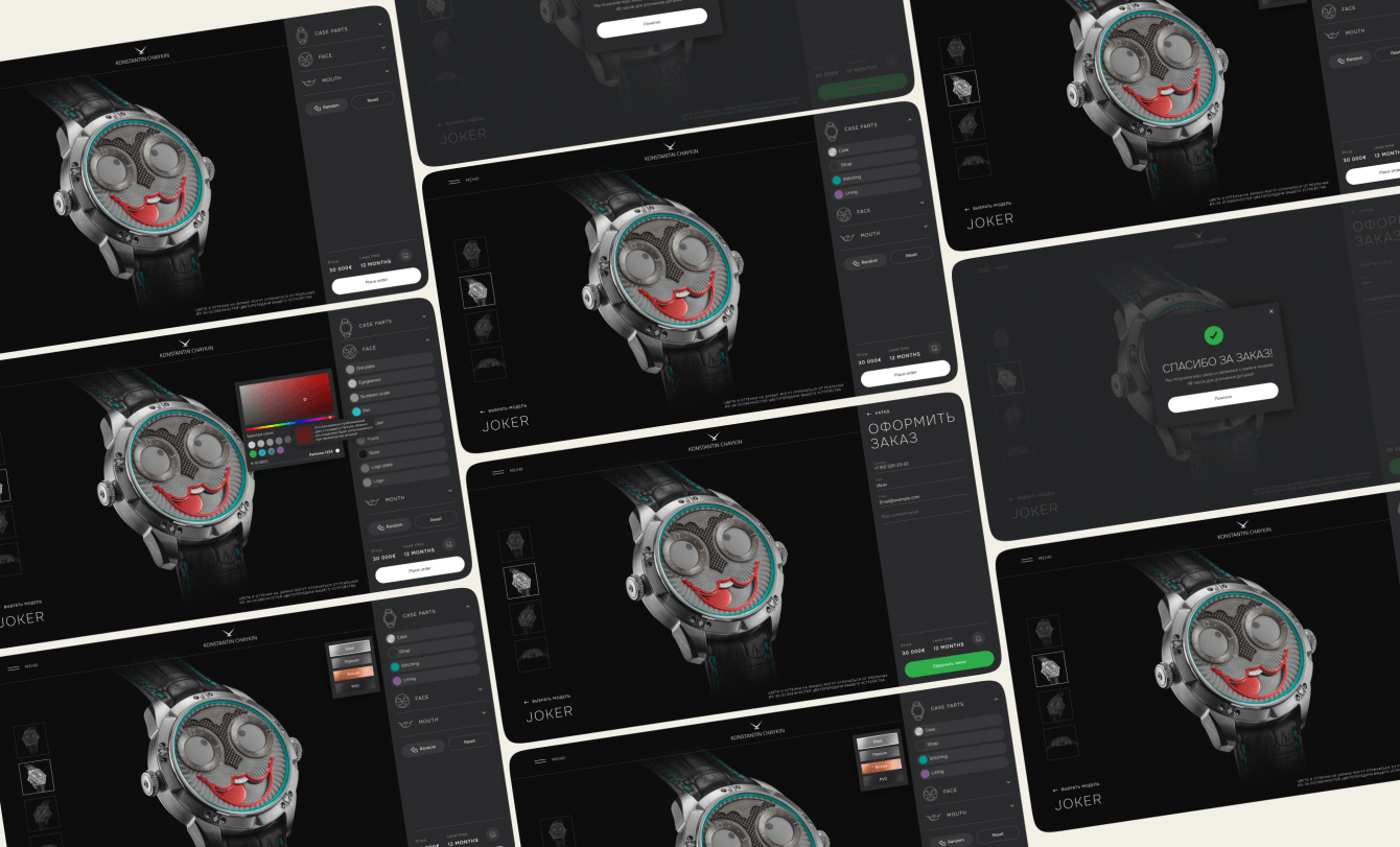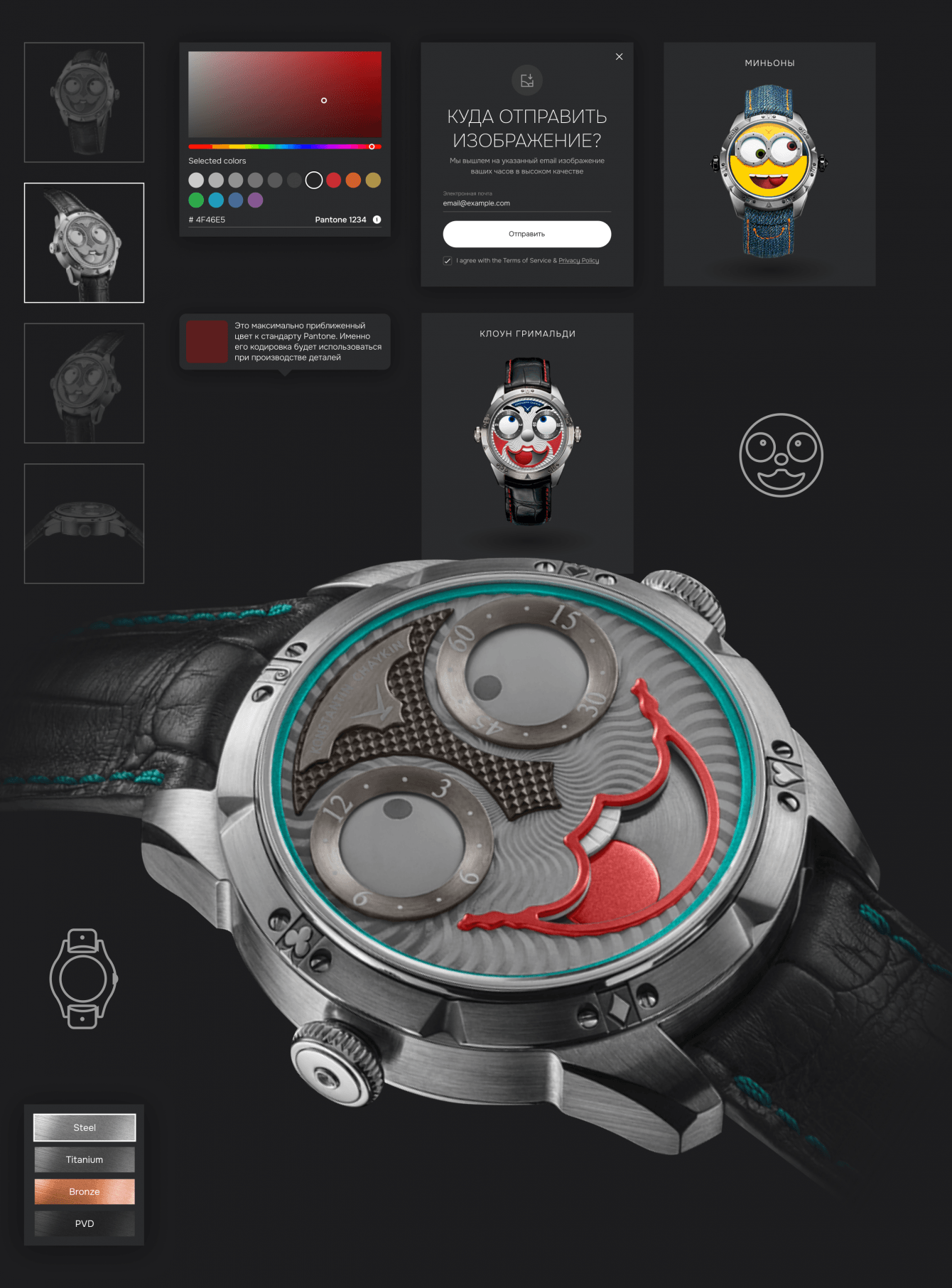 У бренда есть известные модели с полюбившимся всем стилем, такие модели представлены на официальном сайте, в редизайне которого мы участвовали ранее. В дополнение к этому есть возможность заказать производство часов с индивидуальным дизайном. Чтобы клиент мог создать образ будущих часов, компания использует веб-конструктор, который помогает визуализировать свои идеи, посмотреть на часы в разных цветах, материалах и ракурсах.