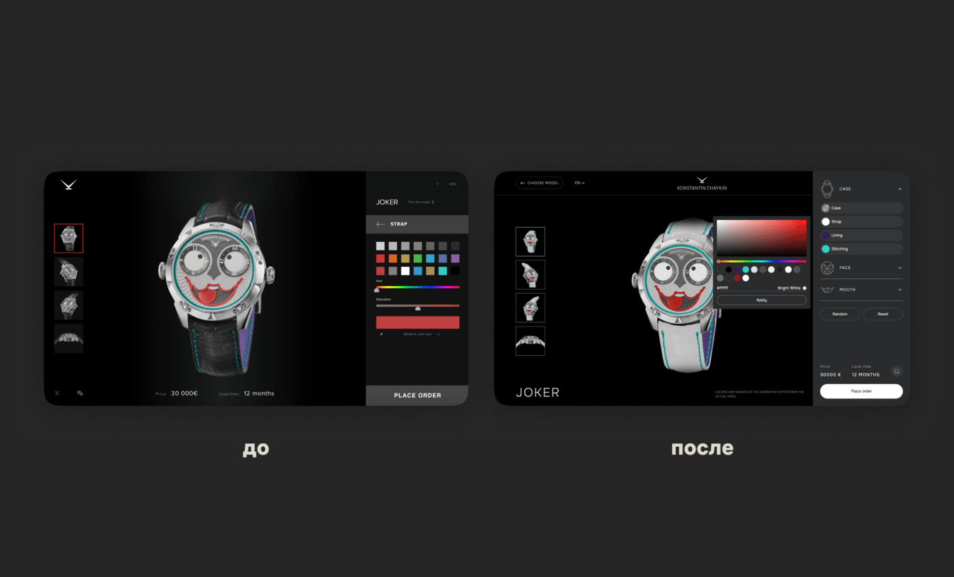 Чтобы выбрать группу деталей, отдельную деталь, добраться до палитры выбора цвета и вернуться в исходное меню, требовалось сделать 4 клика. Мы предложили спрятать всё боковое меню в гармошку, а палитру вынести слева от пунктов, как в Figma, чтобы переключение между деталями часов происходило понятно и быстро.