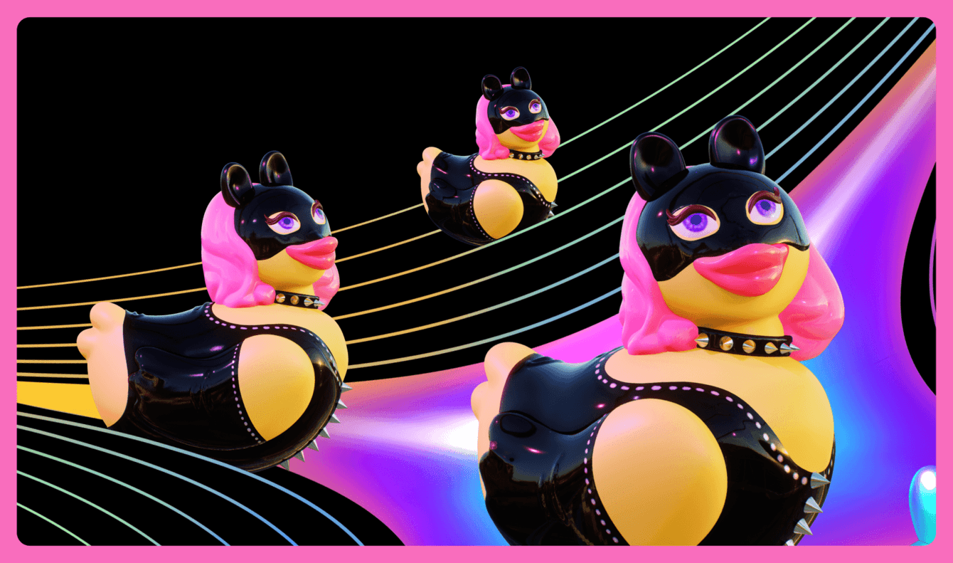 Резиновая уточка — символ Eroticon, отсылающий к игрушкам для взрослых. Пожелание заказчика — точно оставить эту пасхалку. Мы не стали мелочиться и на первый экран добавили игривого маскота. Её резиновость и БДСМ-костюм сразу говорят о настроении мероприятия.