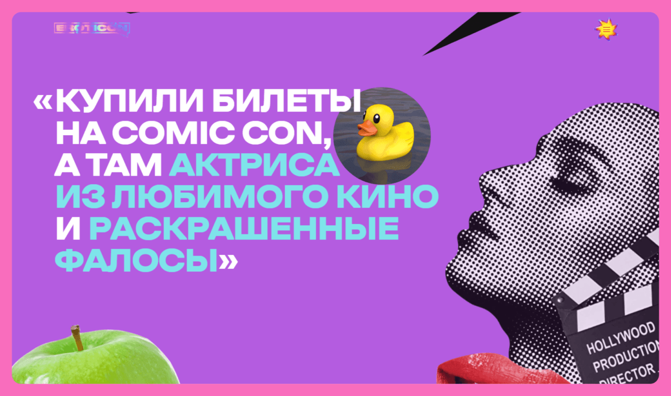 Но рамки есть даже у таких провокационных задач. Цель лендинга — рассказать про ивент, заинтересовать пользователя и продать ему билеты. Откровенно вульгарный тон отпугнул бы целевую аудиторию из-за ассоциации с секс-вечеринками. Мы рассказывали про фест открыто и с юмором, но держали себя в руках.