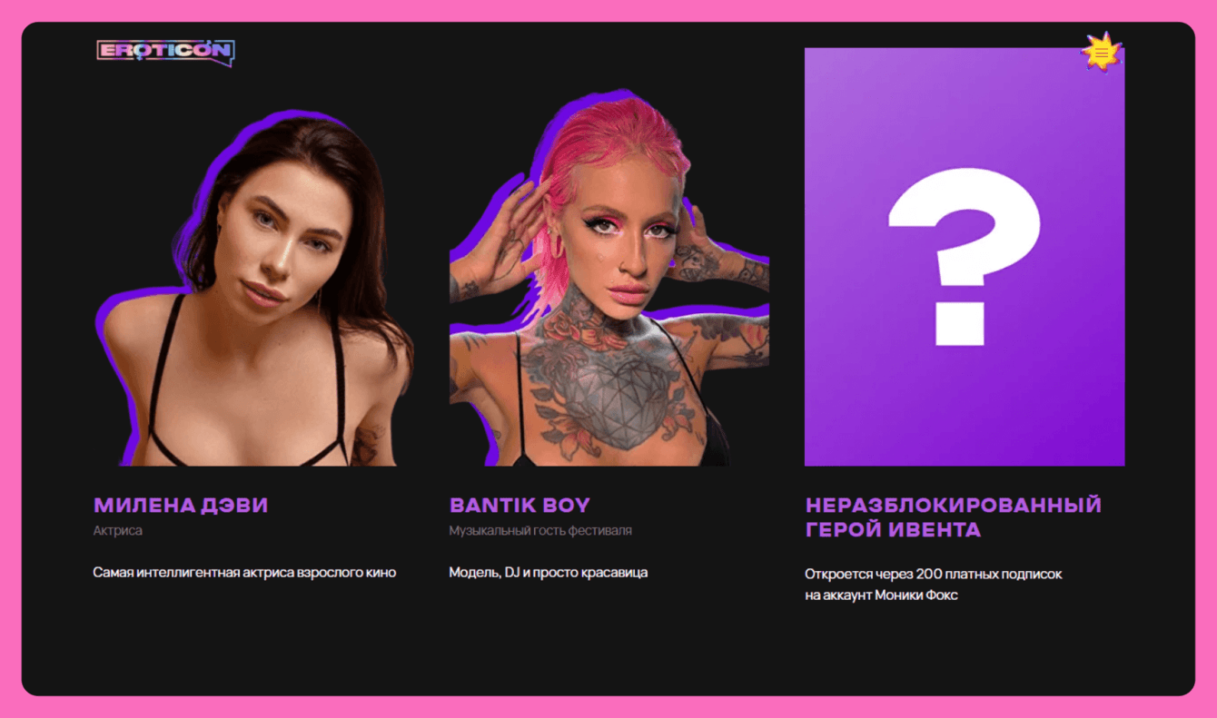 Блок с участниками сделали стандартным, чтобы заказчику было легко добавлять новых звёзд. Для потенциальных актрис придумали фишку с неразблокированным героем ивента. Цена вопроса: 200 платных подписок на аккаунт Моники Фокс.