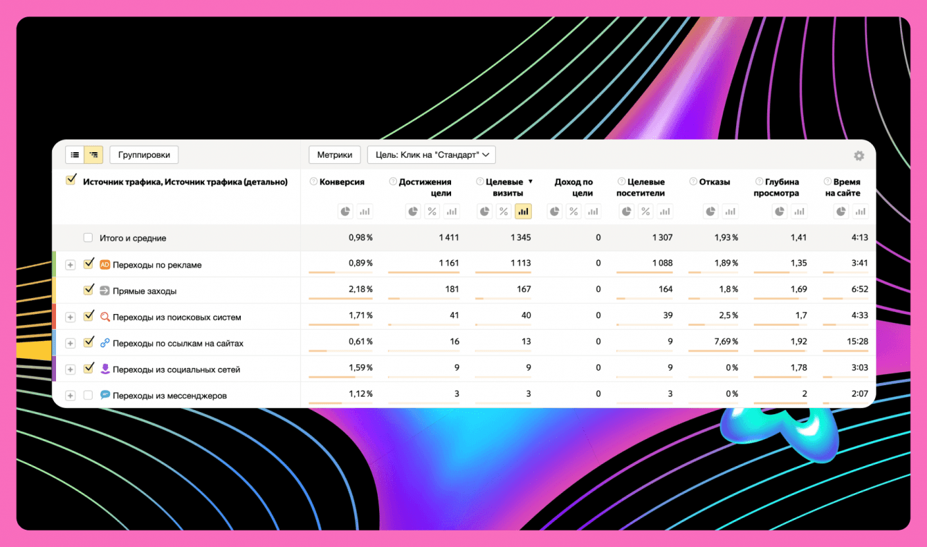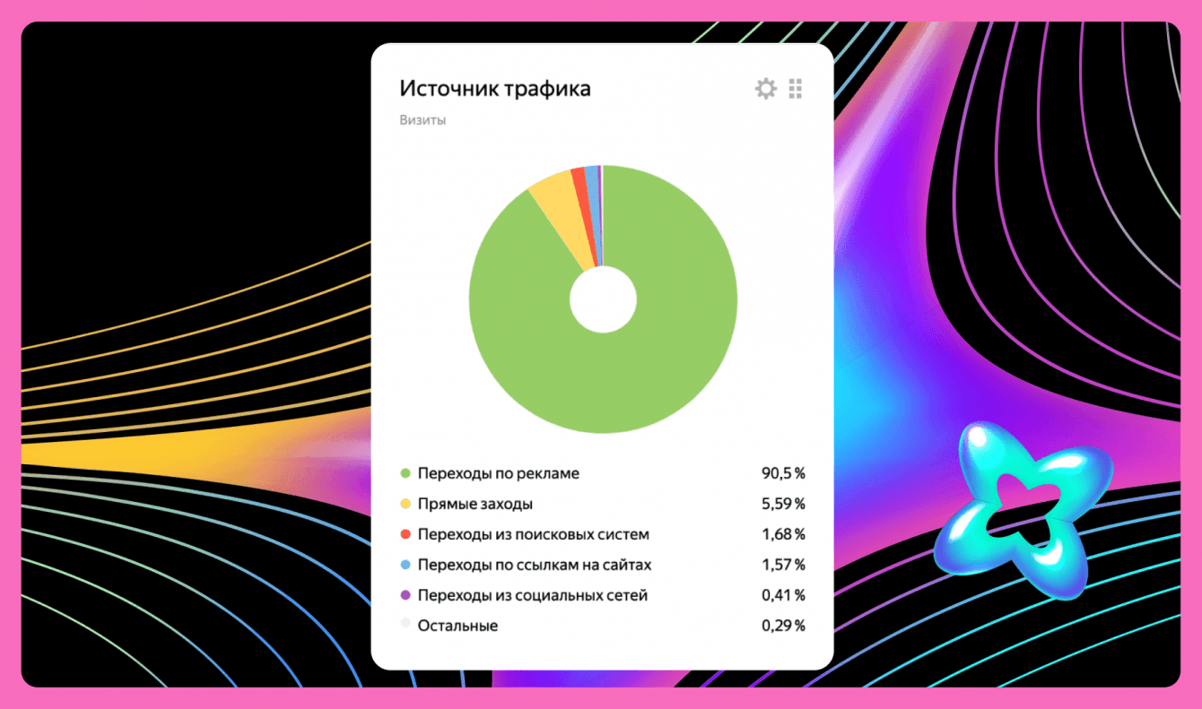 Ещё нашему сайту «доверили» большой рекламный бюджет. Затраты составили в районе 1 млн ₽. В итоге 90,5 % посетителей пришло именно с неё.