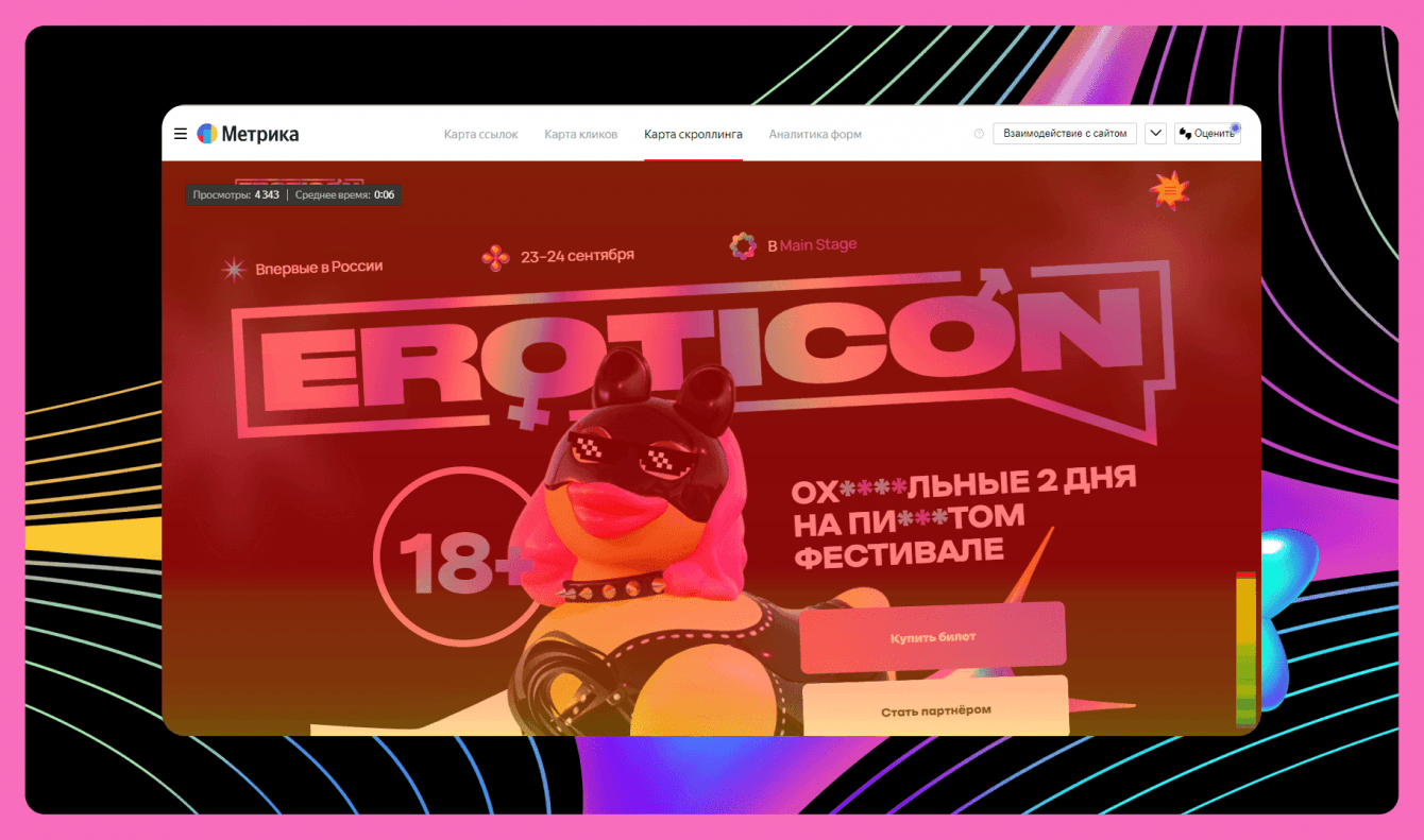 За 1,5 месяца сайт показал довольно хорошие результаты. Благодаря яркой подаче запретной темы удаётся привлекать внимание пользователей. Весь лендинг в беглом темпе можно пролистать за 1 мин 10 сек. В этом мы убедились, когда записывали видеоскроллы для статьи.