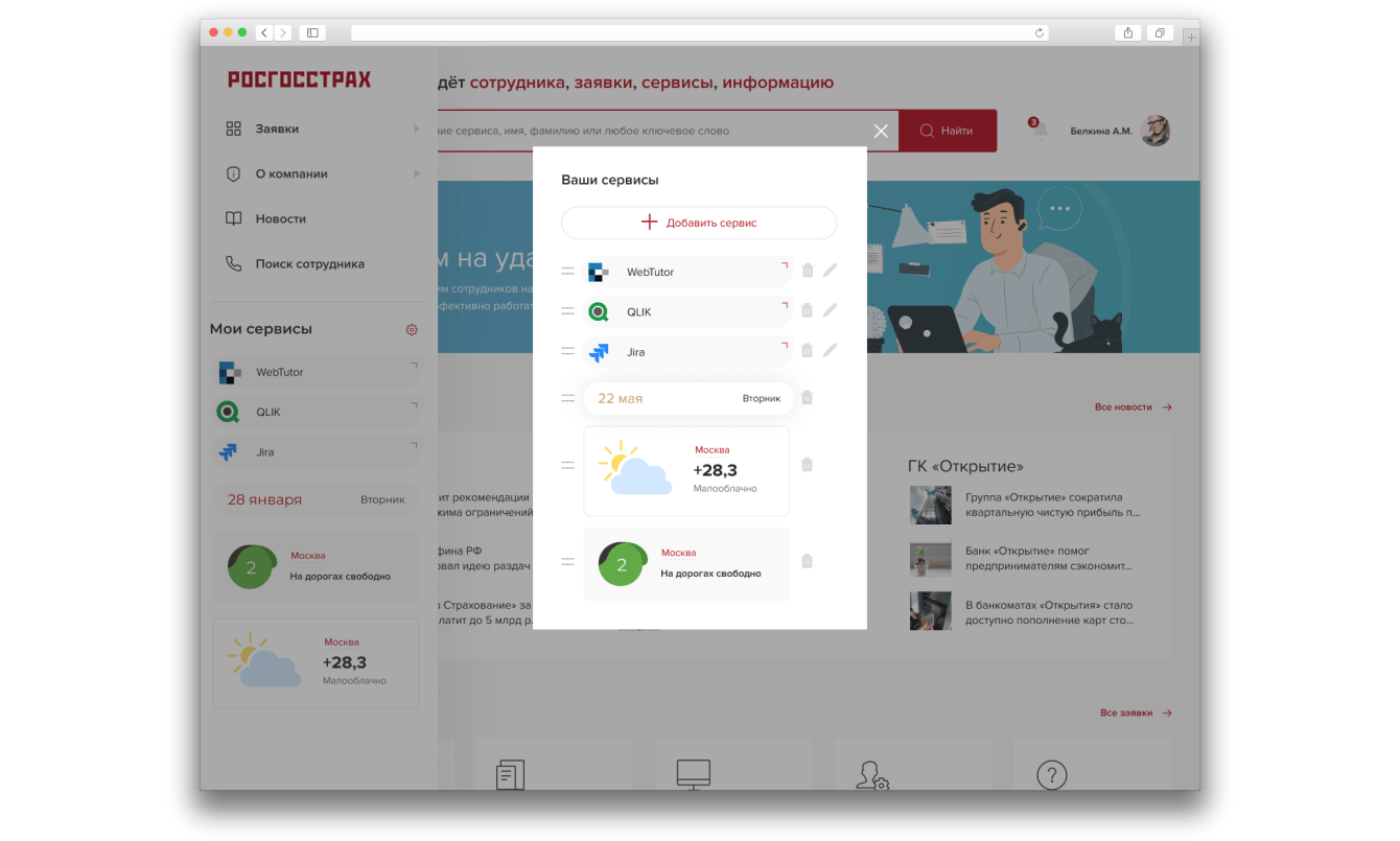 В меню для пользователей мы разработали специальный блок с популярными сервисами. Часть сервисов администратор системы настраивает для всех пользователей, а вторую часть сотрудник может настроить под себя.