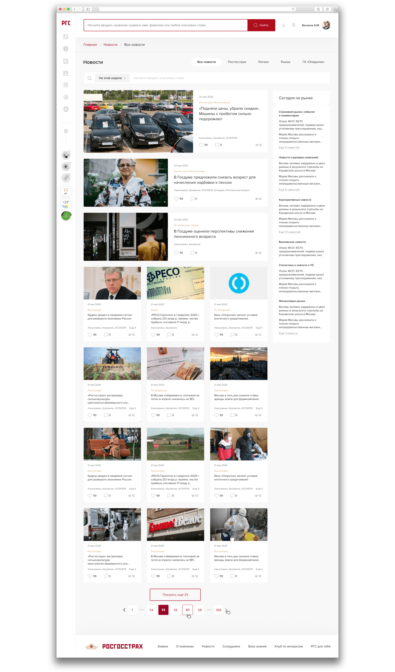 По сути, раздел новостей «Росгосстраха» является корпоративным журналом, а не просто списком анонсов. В верхней части страницы расположена главная новость, после нее — 2 «субновости», после них плиткой расположен остальной контент.