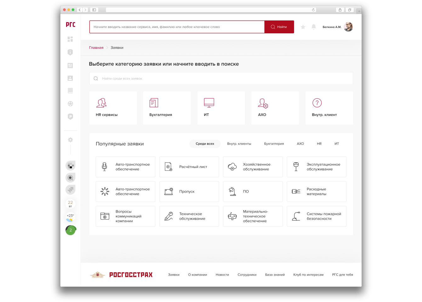 Блок заявок включает 5 популярных категорий и ссылки на часто используемые сервисы. Внутри каждой категории могут быть подкатегории либо сами заявки. Формы для каждого типа заявок отличаются. Доступна персонализация раздела: каждый пользователь может настроить самостоятельно, какие заявки должны быть под рукой.