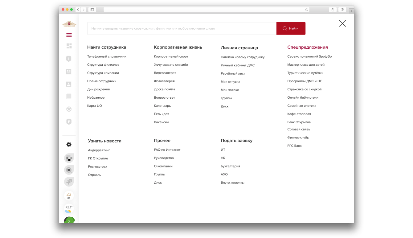 В отдельном разделе интранета содержится каталог услуг. Удобная навигация помогает перейти с разводной страницы в целевую систему — отдельно авторизовываться в ней не нужно. Также доступен удобный поиск.