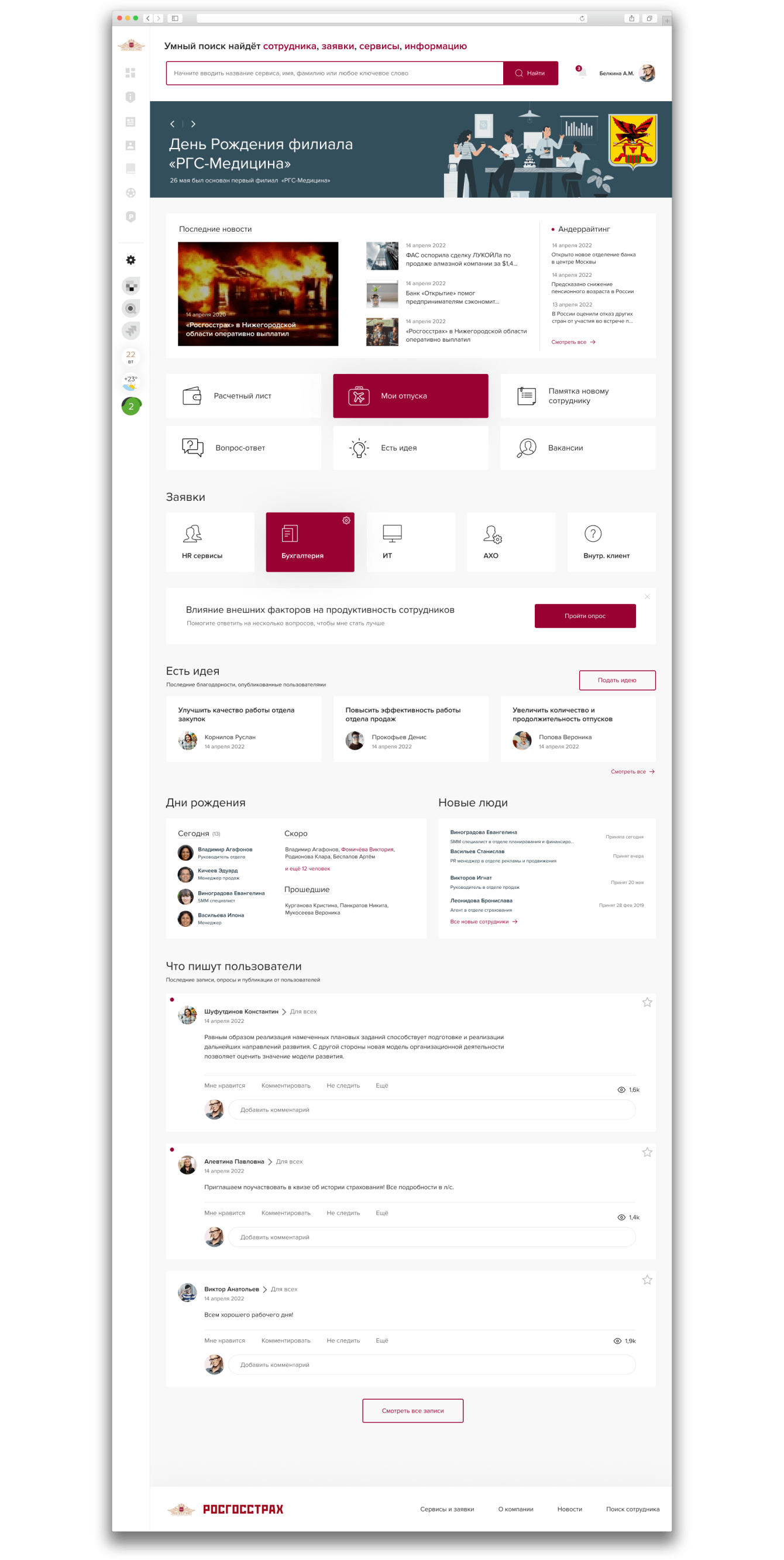 • Информация о ближайших днях рождения и новых сотрудниках (с привязкой к региону);