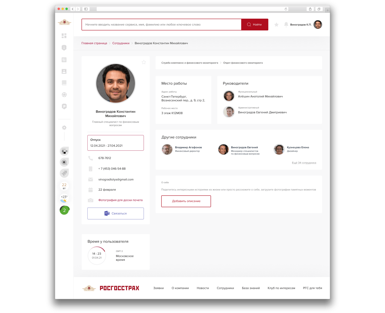 Информация о департаменте, филиале, рабочем месте, руководителе и коллегах «подтягивается» из кадровой системы, блок «О себе» каждый сотрудник заполняет самостоятельно.