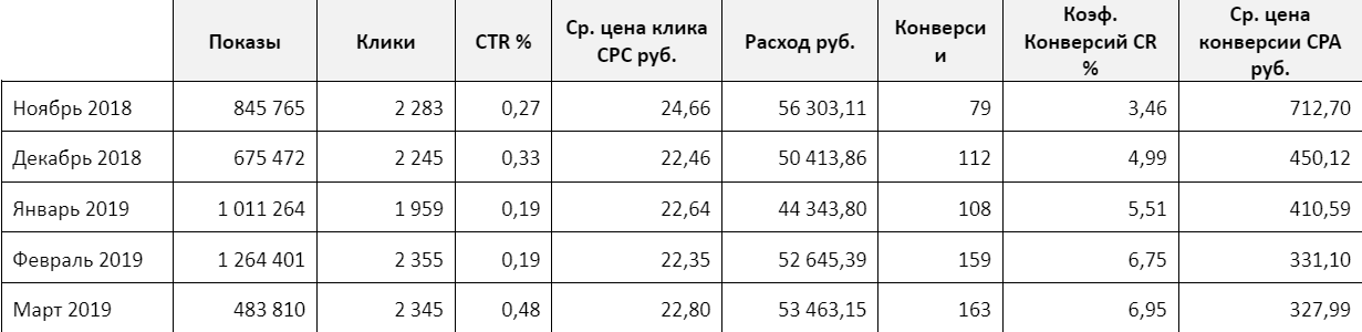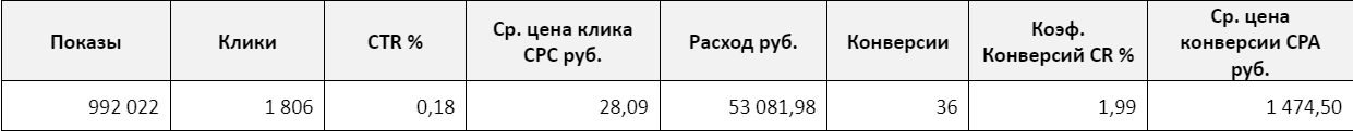 Таблица 1. Средние показатели старых рекламных кампаний за месяц Поиск и РСЯ (до начала работ)