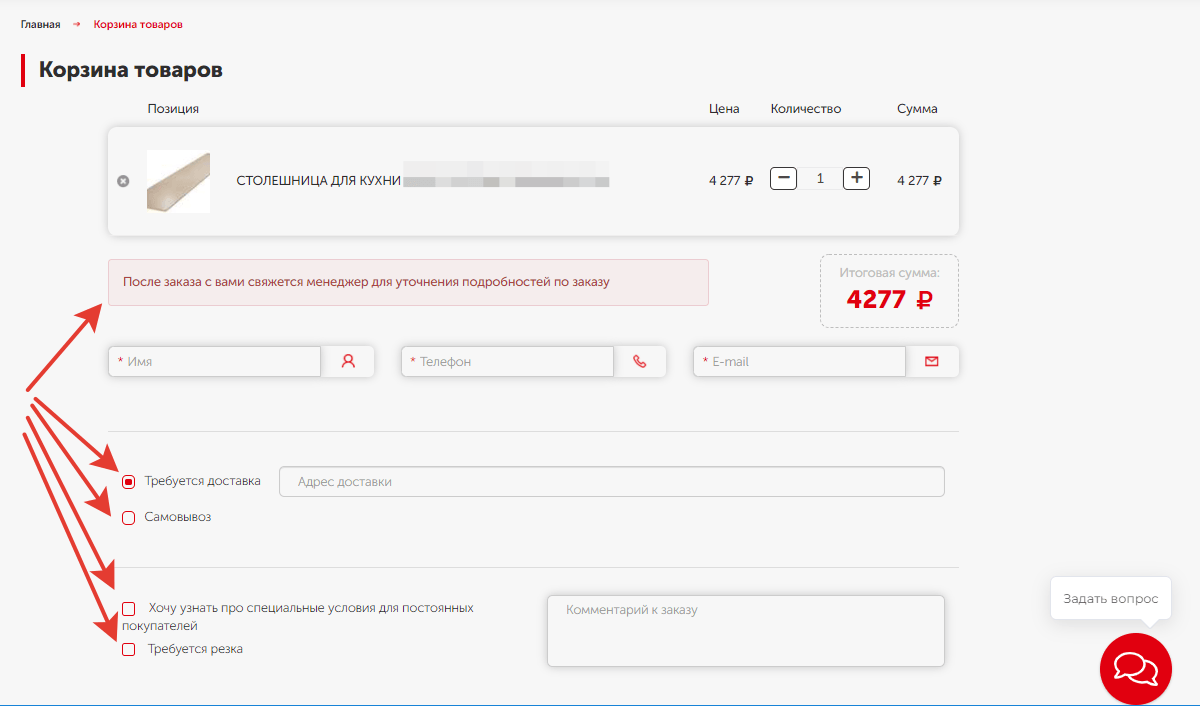 Интернет-магазин клиента, несмотря на наличие каталога и корзины, предполагает много уточнений со стороны покупателя перед оплатой: нельзя просто взять, положить столешницу в корзину и быстро оформить заказ. Людям хочется сначала узнать, можно ли вырезать столешницу под их размеры, раковины, смесители, учесть нюансы встроенной мебели и прочее. Круг таких вопросов достаточно широк и его сложно стандартизировать.