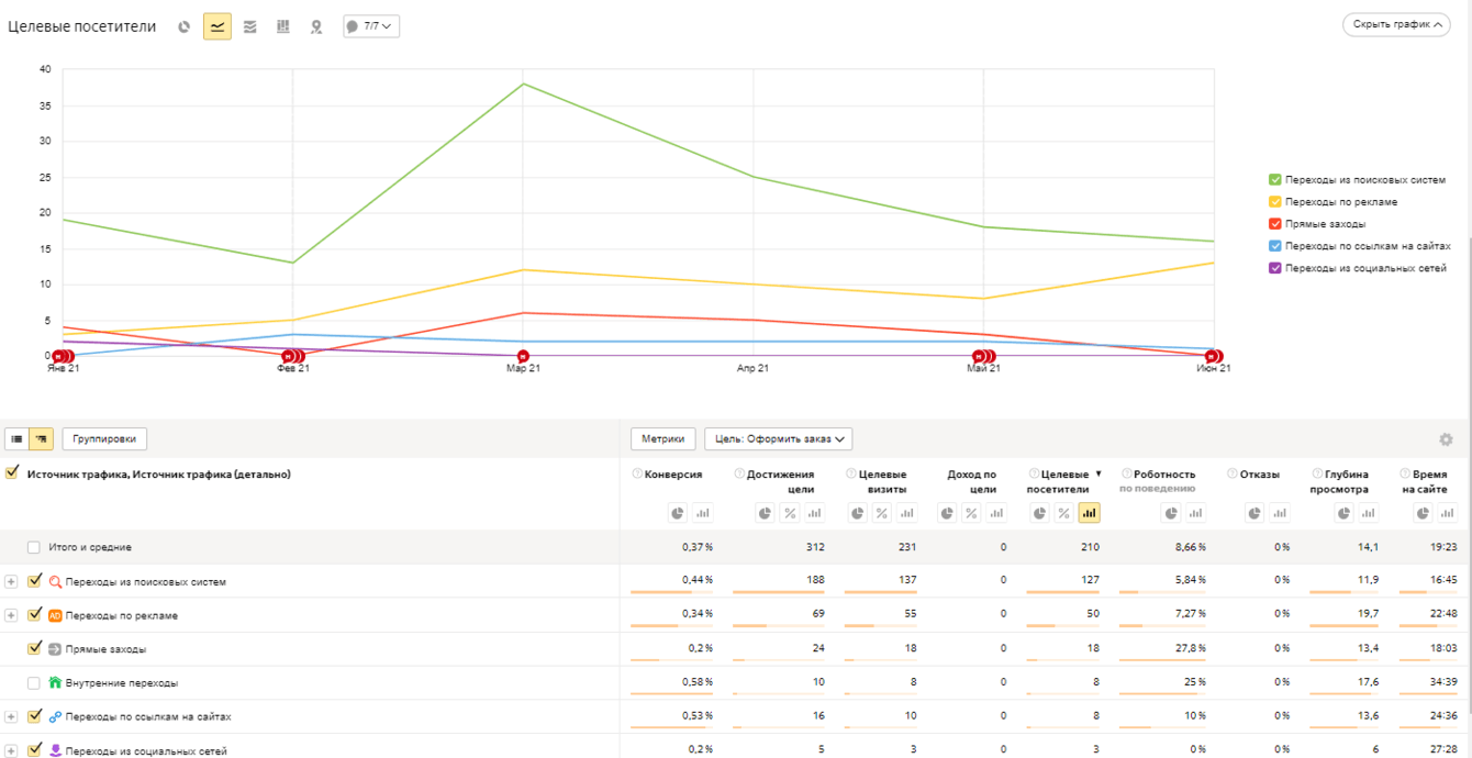 Вся информация, которой обладал клиент: оборот общий, и с рекламы, и с поиска, составляет в среднем 400 тысяч руб. в месяц, иногда чуть больше, иногда чуть меньше. За полгода (с января по июнь 2021) клиент не заметил ощутимого роста в деньгах, оборот оставался на одном и том же уровне, исключение - март, который всегда показывал себя хорошо из-за сезонности бизнеса. Заказчик хотел увеличить оборот, но не понимал, за счет чего можно вырасти и что нужно менять в своем маркетинге. Платить больше за рекламу он был не готов, но хотел попробовать заняться вложениями в более долгосрочные работы (SEO-продвижение и техническое улучшение сайта).