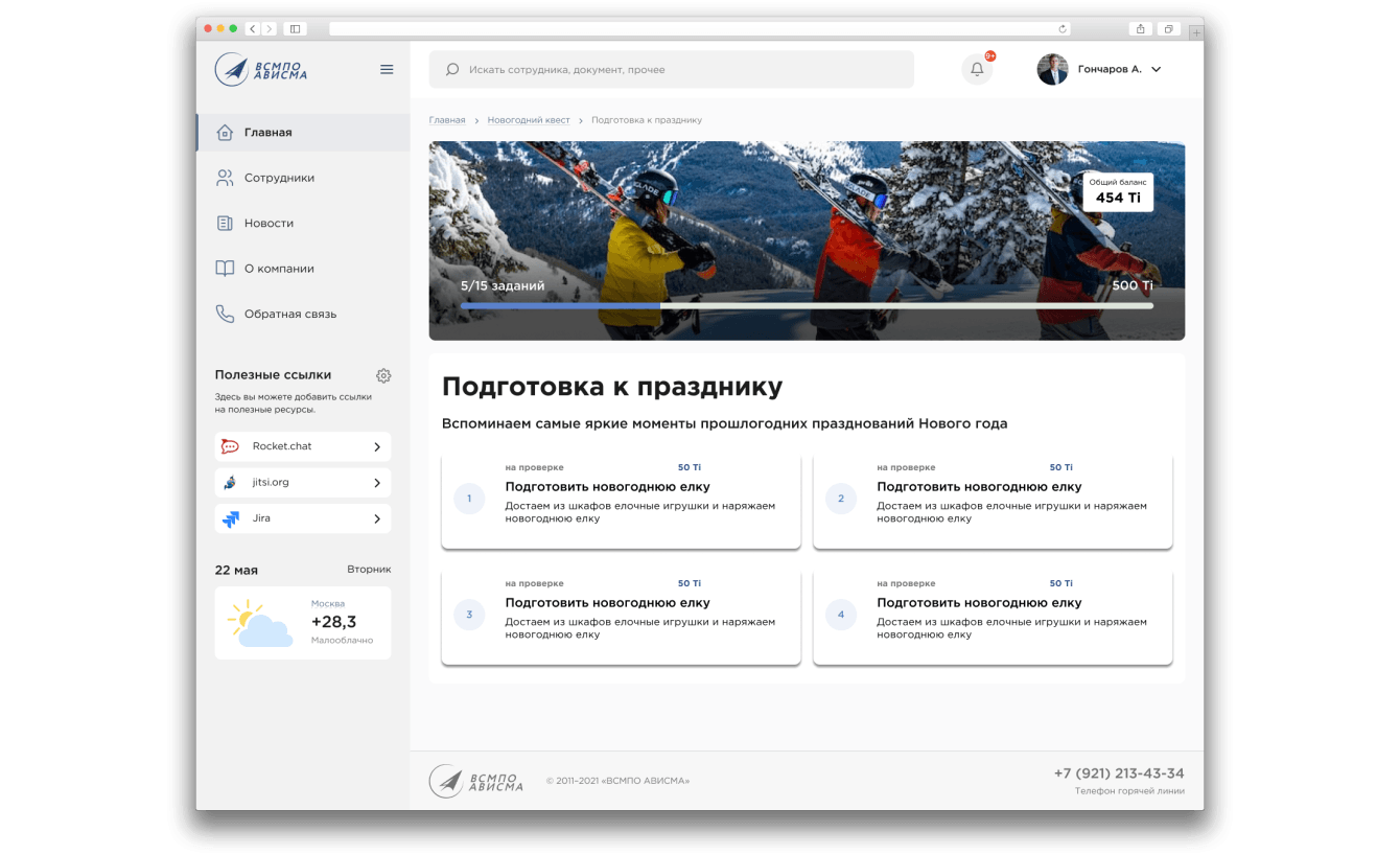 В преддверии новогодних праздников мы помогли запустить в Корпорации Новогодний квест – новый инструмент корпоративных коммуникаций с элементами геймификации. Суть квеста состоит в выполнении заданий, за которые на баланс сотрудников зачисляется внутренняя валюта Корпорации — «титаны» (Ti).