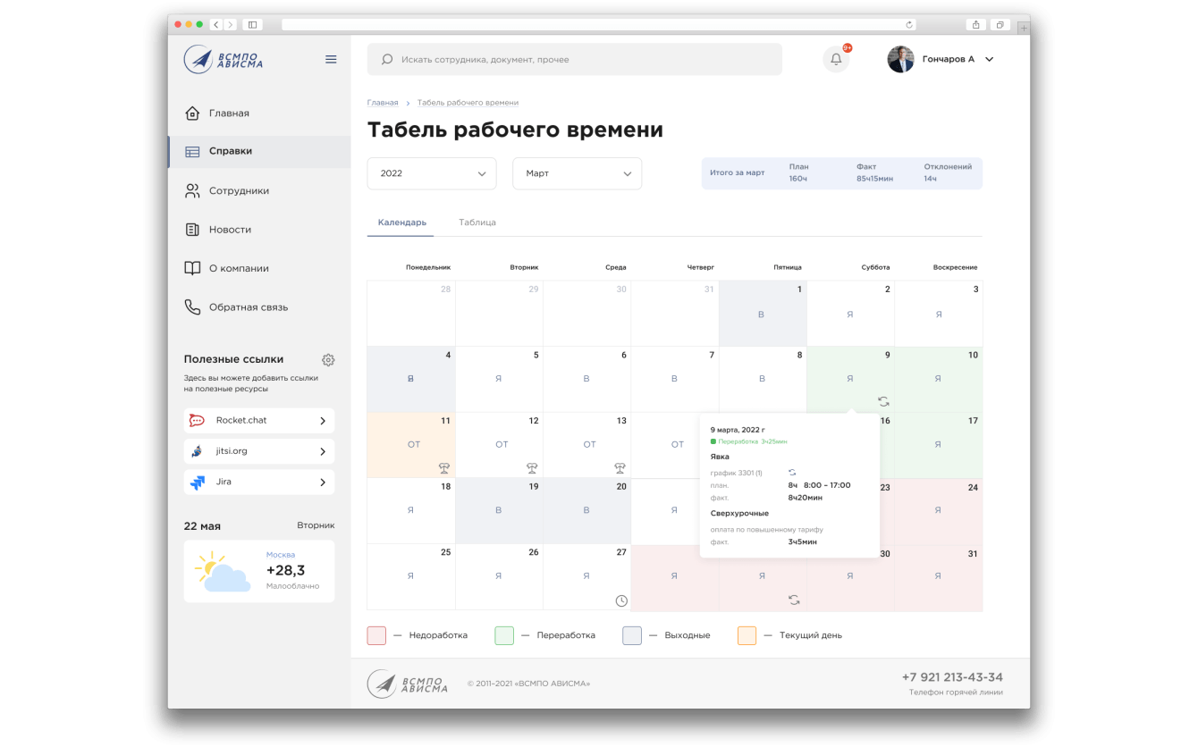 В сервисе отражаются рабочие смены сотрудника с зафиксированными часами по выработке и отсутствиями. Сотруднику доступен просмотр планового и фактического количества рабочих часов. При формировании табеля учитывается график плановых отпусков — эти интервалы выделяются в календаре розовым цветом.