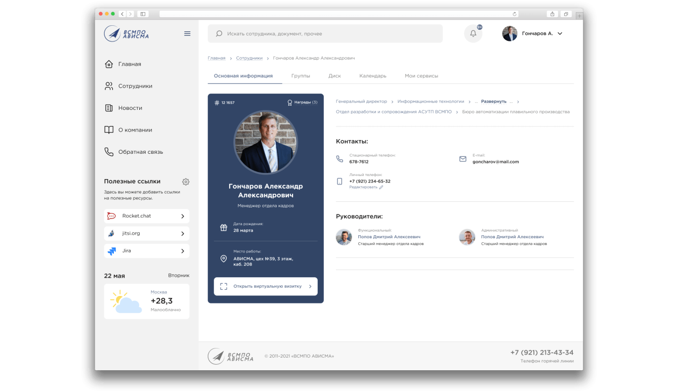 В личном кабинете отображается вся необходимая информация о сотруднике, которая может пригодиться коллегам: контактные данные, ФИО непосредственных руководителей, информация об участии в корпоративных объединениях и активностях.