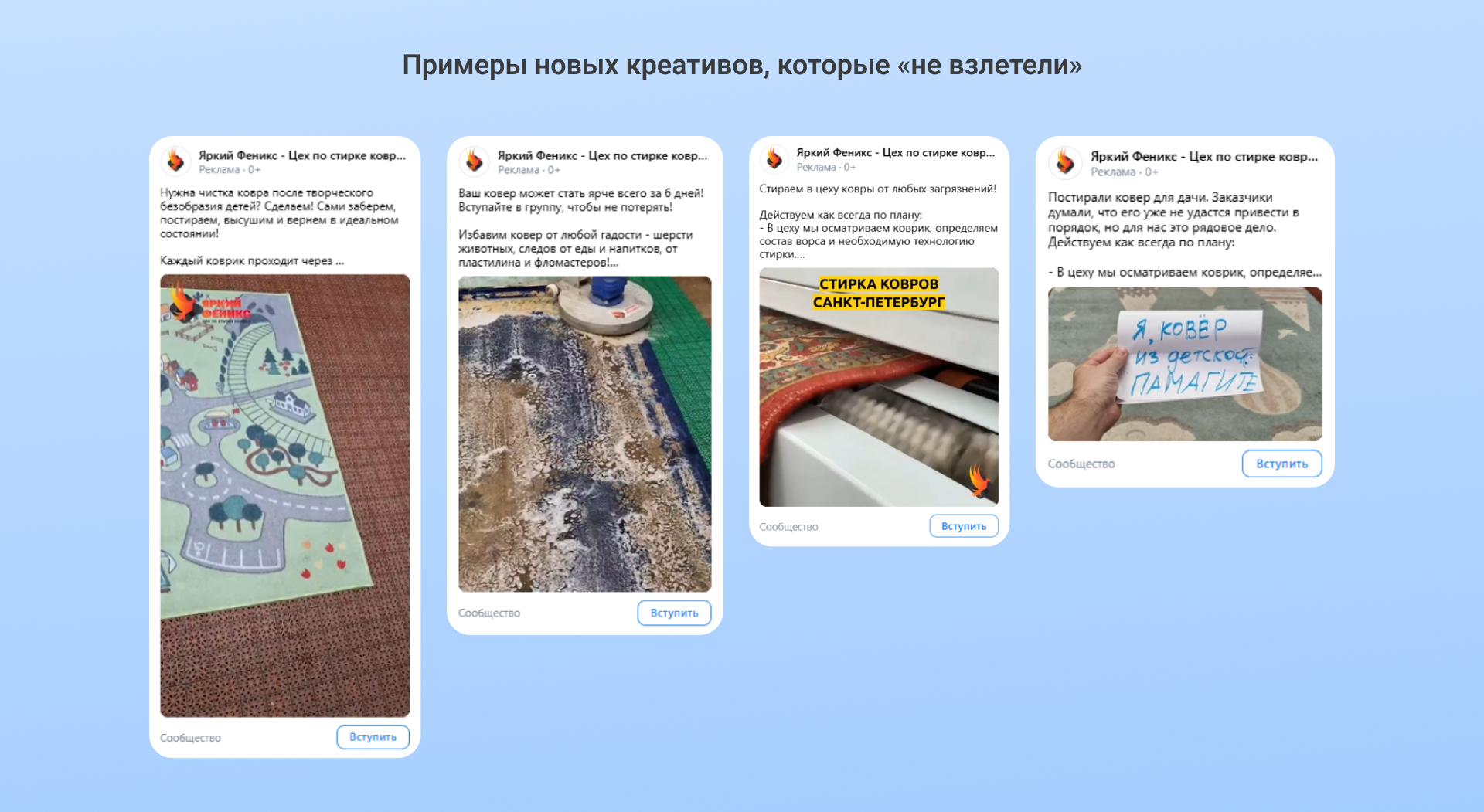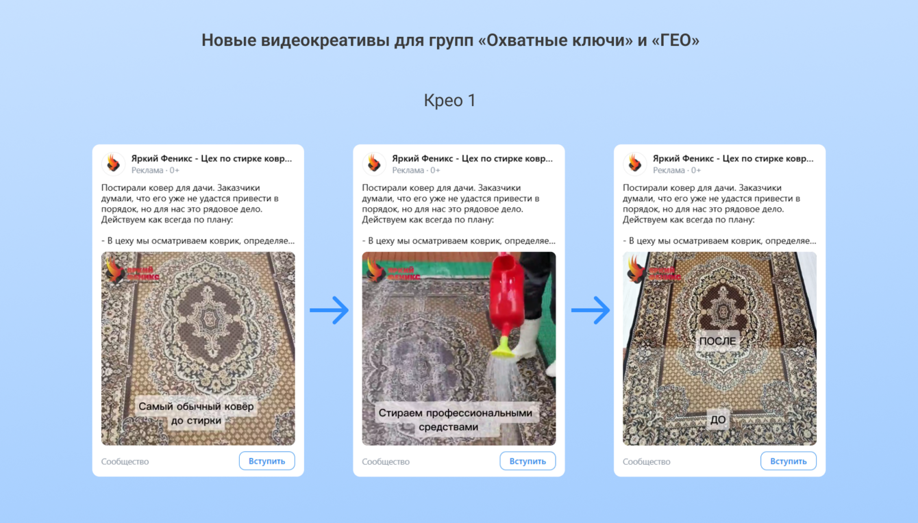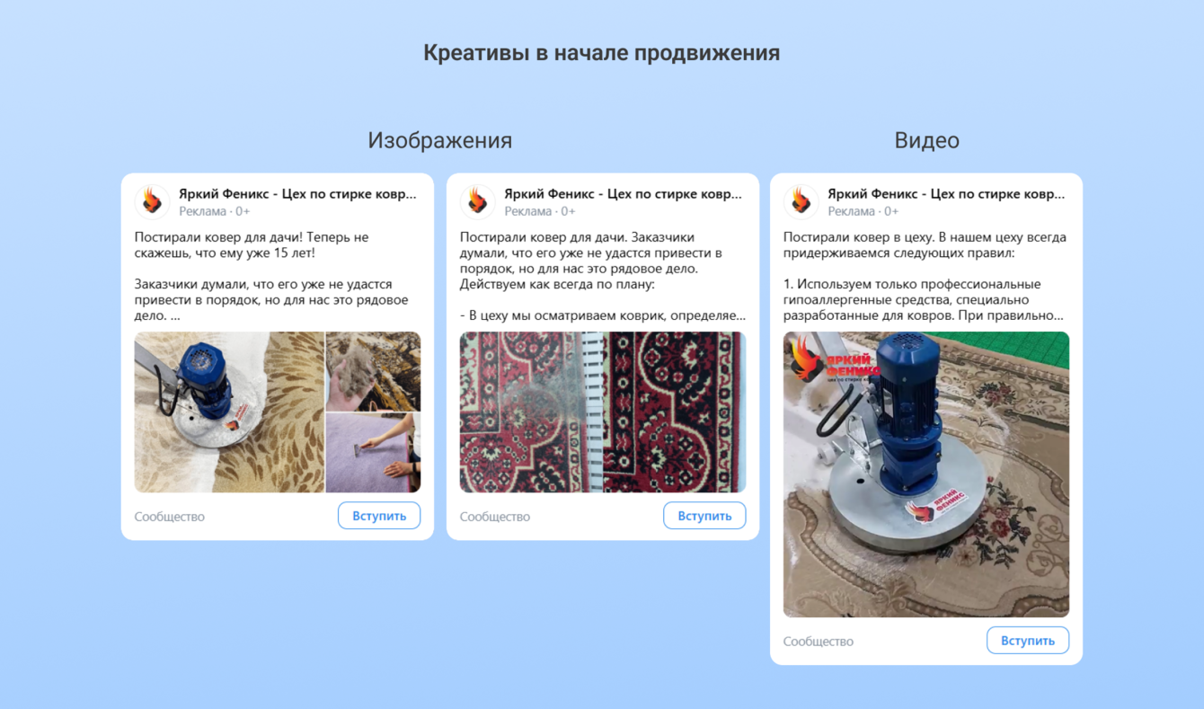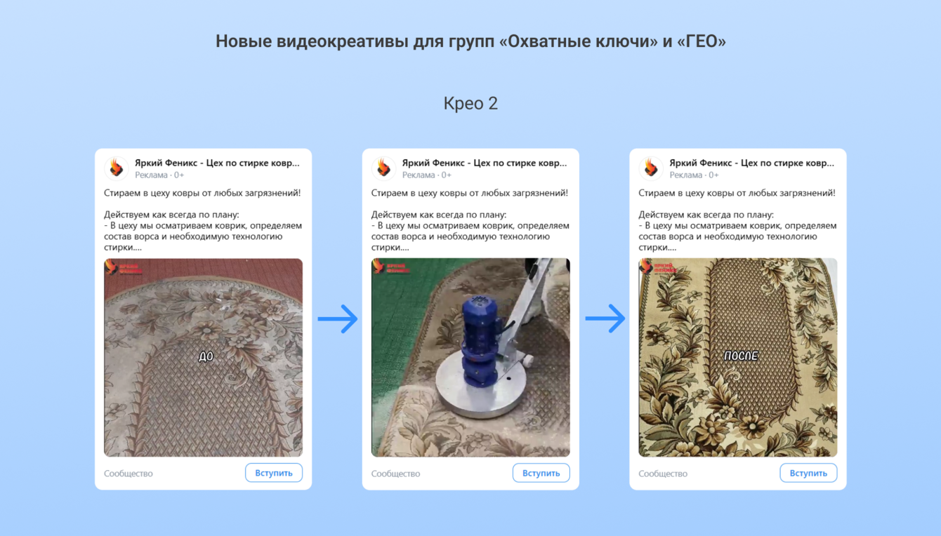 Креативы взяли с тестового периода. В них использовали материалы заказчика: коллаж с процессом работы, фото ковра в состоянии до и после чистки, а также видео стирки.