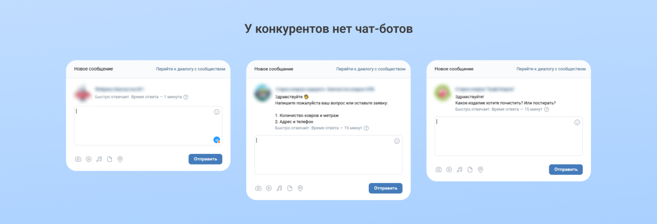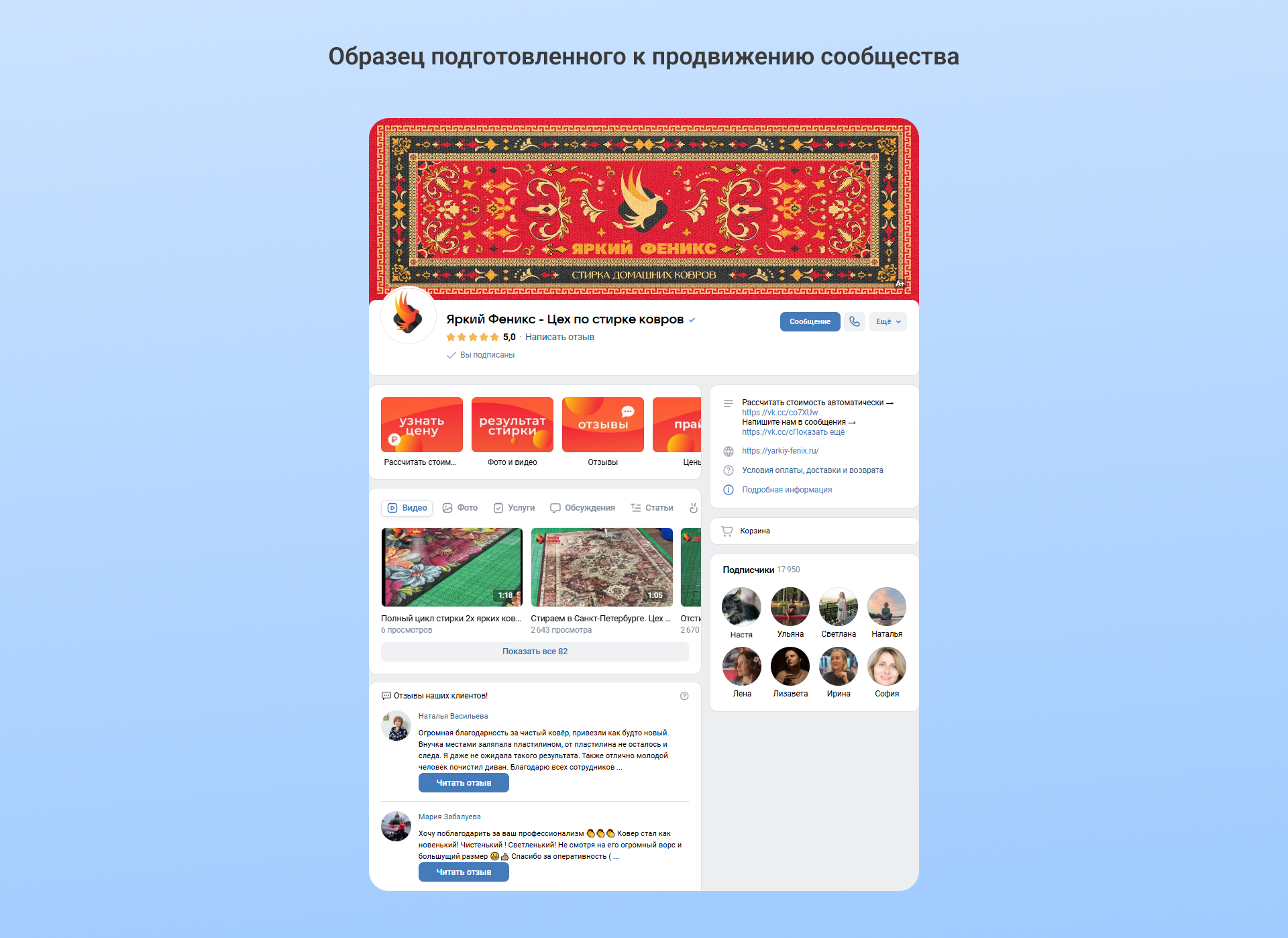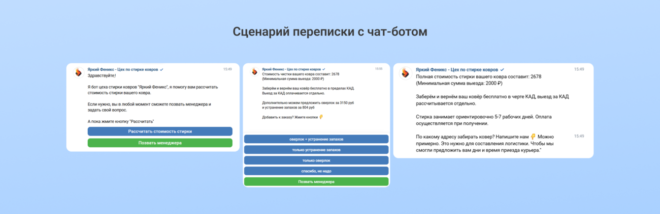 Пример «Яркого Феникса» можно брать за образец: в их сообществе есть множество отзывов клиентов, видео со стиркой ковров, прайс, регулярный контент и самое главное — автоматизированный расчет цены в чат-боте. Человек знает, что его ждет еще до общения с менеджером.