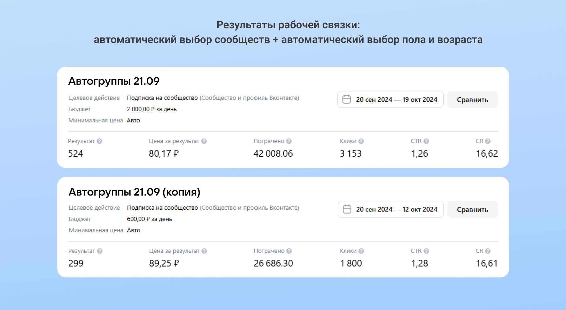 Лучший результат принесла группа с автоматическими настройками: 564 подписчика по 88 рублей. Стабильные результаты получали дольше месяца.