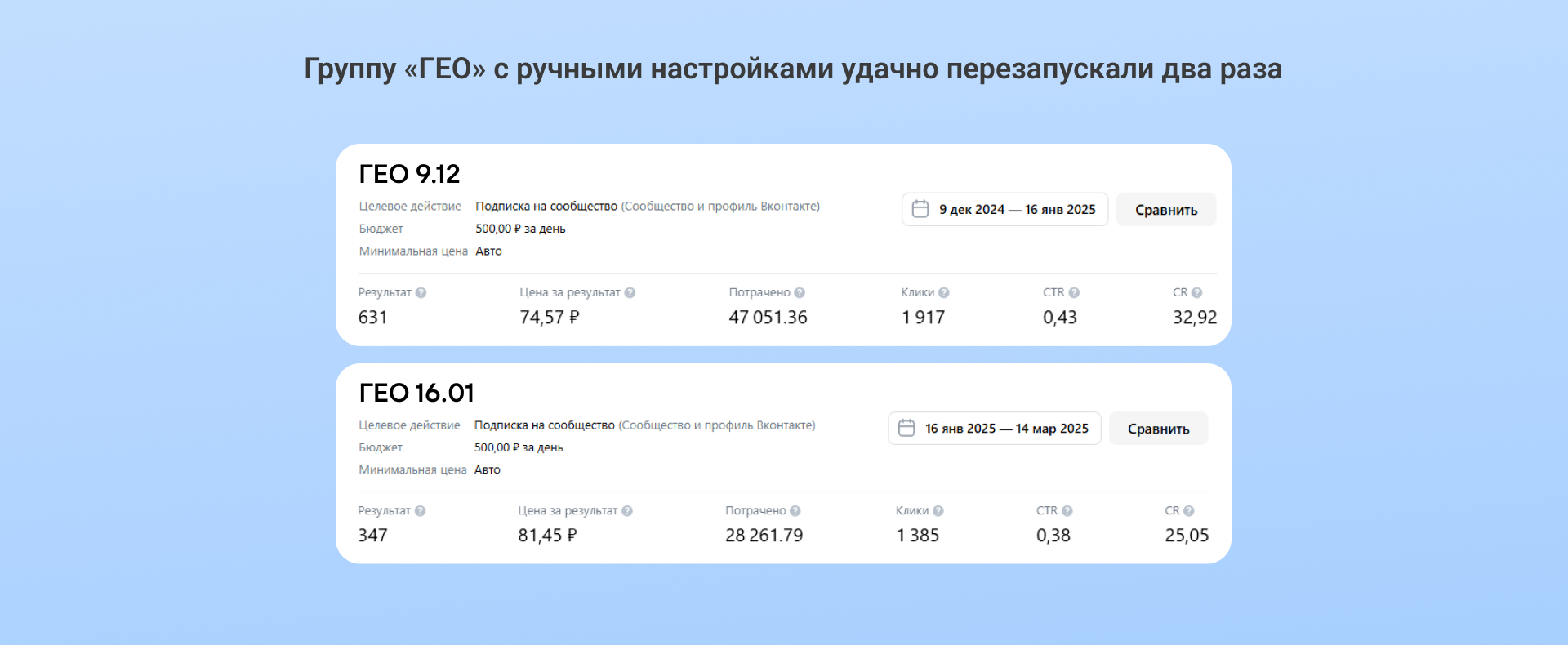 — Смогли наладить работу алгоритмов VK ADS с помощью перезапусков групп объявлений и тестирования новых связок.