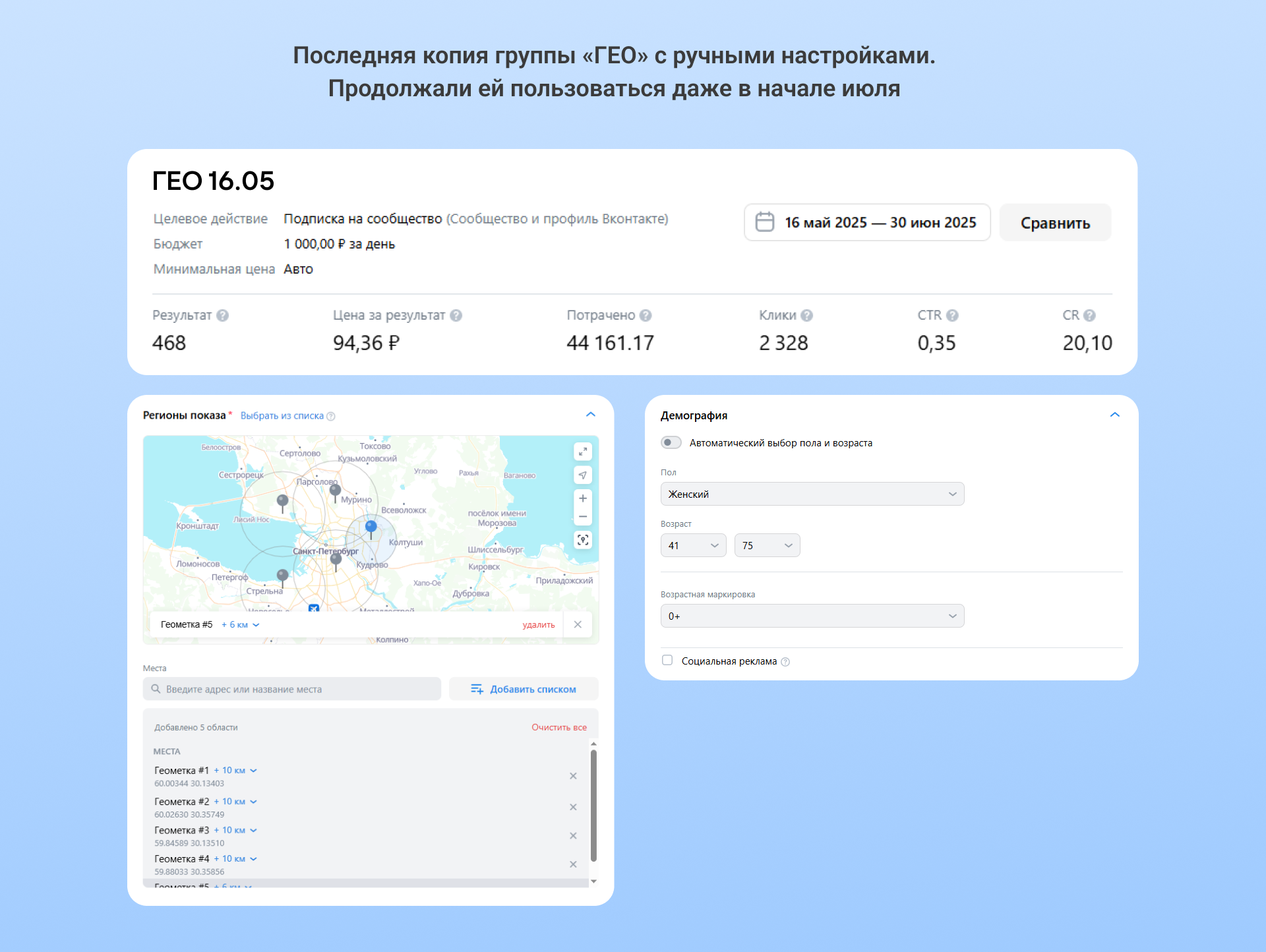 В группе объявлений «ГЕО» опирались на две настройки: геометки по СПб и демографию. Так мы добивались максимально возможных охватов.
