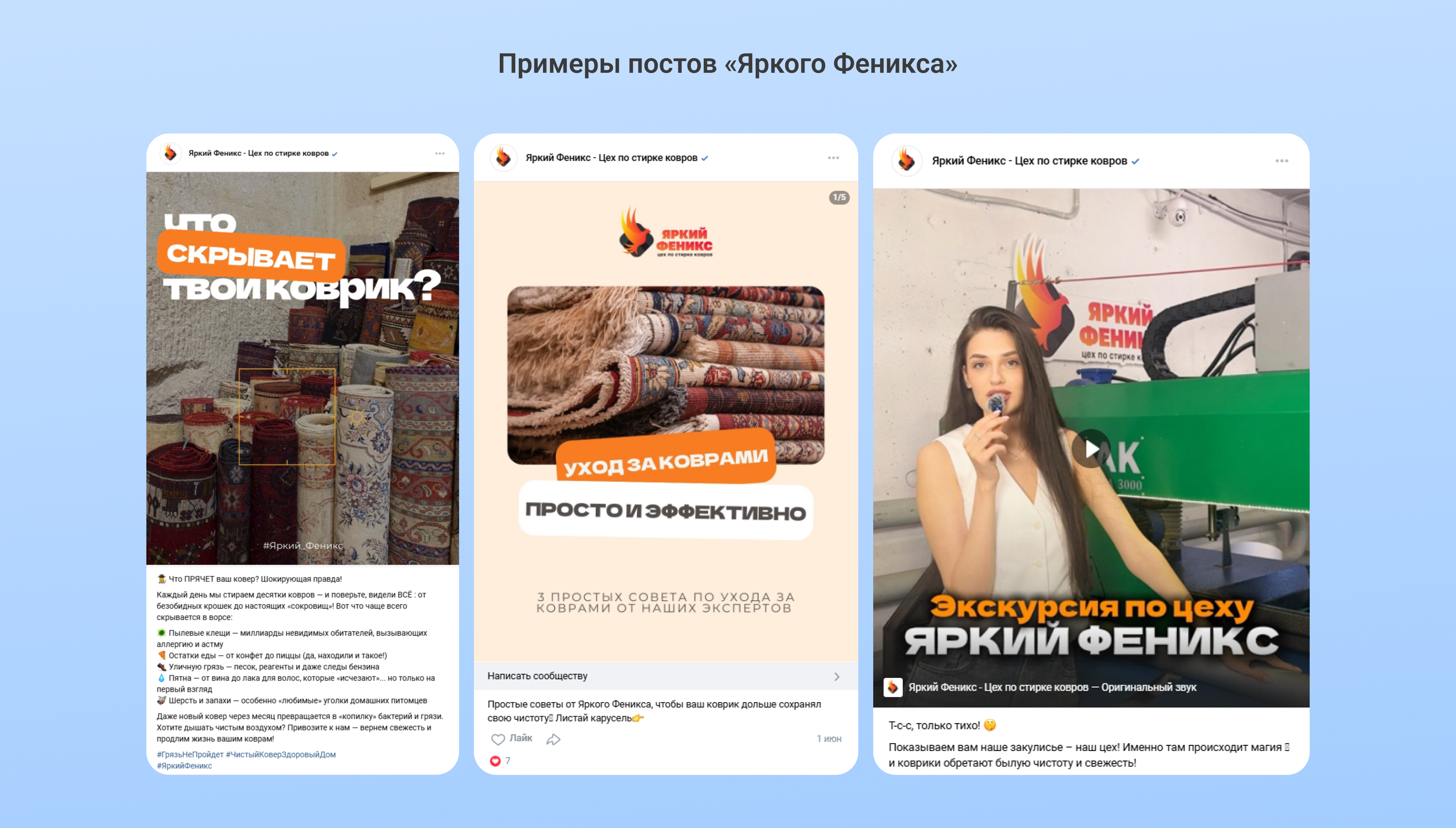 В текстах подробно перечислили этапы «воскрешения» ковров. Так мы показывали преимущества стирки в цеху. В заголовках цепляли знакомыми «болями»: «постирали ковер с дачи» и «стираем ковры от любых загрязнений».