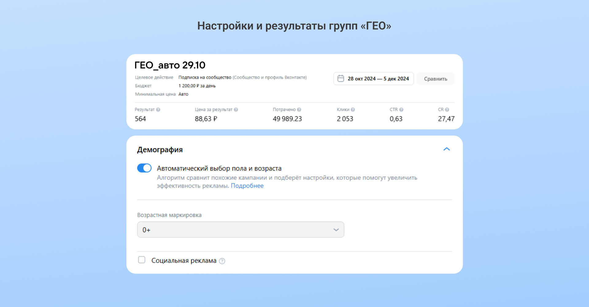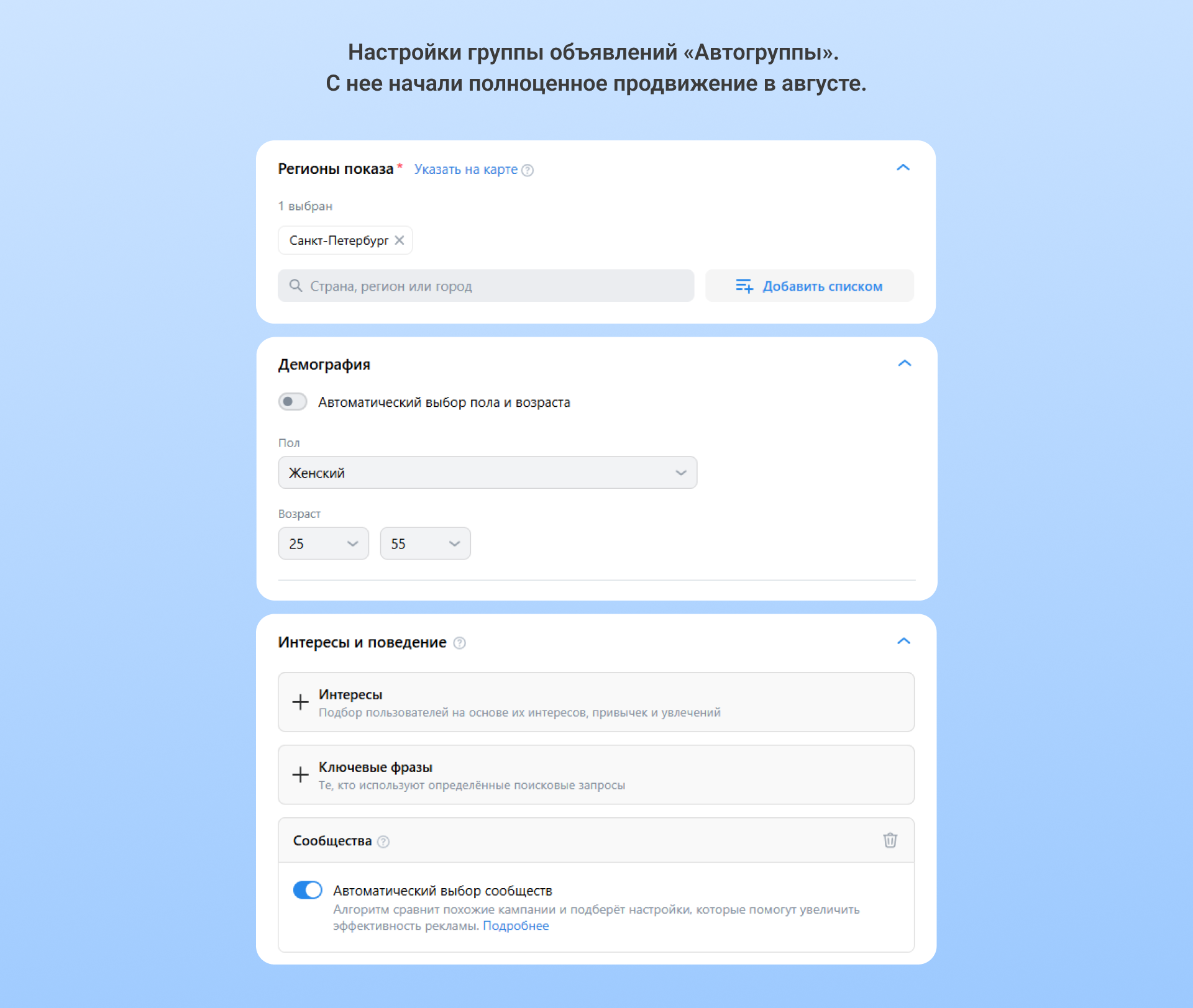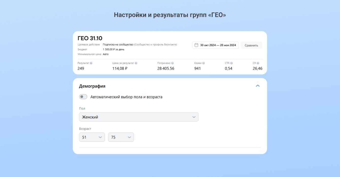 — Автоматические настройки. Сработала комбинация из подбора сообществ и демографии — возможно, были и другие эффективные связки.