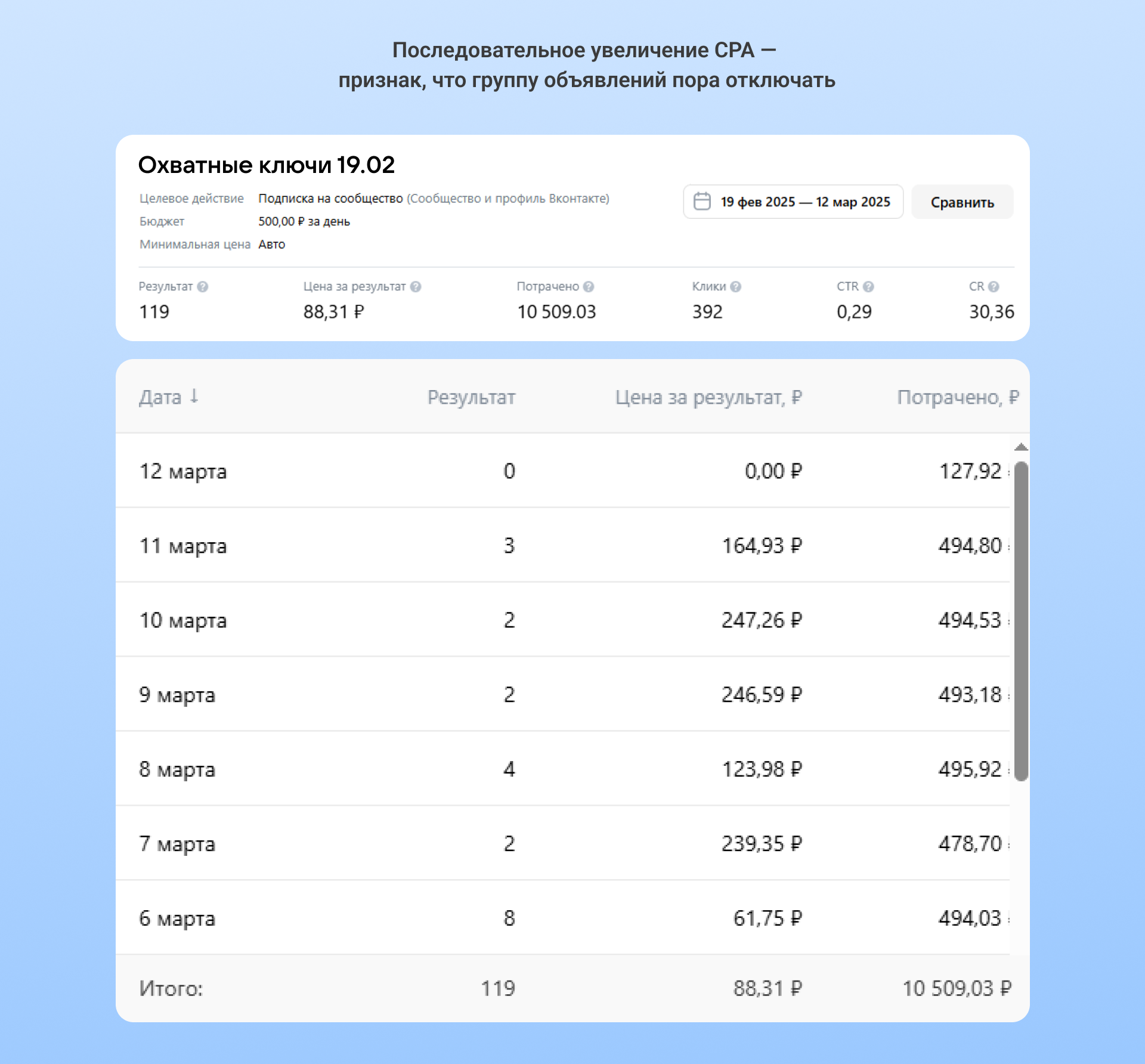 Она работала почти 3 месяца: с 20 ноября по 12 февраля. Но когда три дня подряд CPA увеличивался и достигал почти 200 рублей, стало понятно — ее пора отключать.