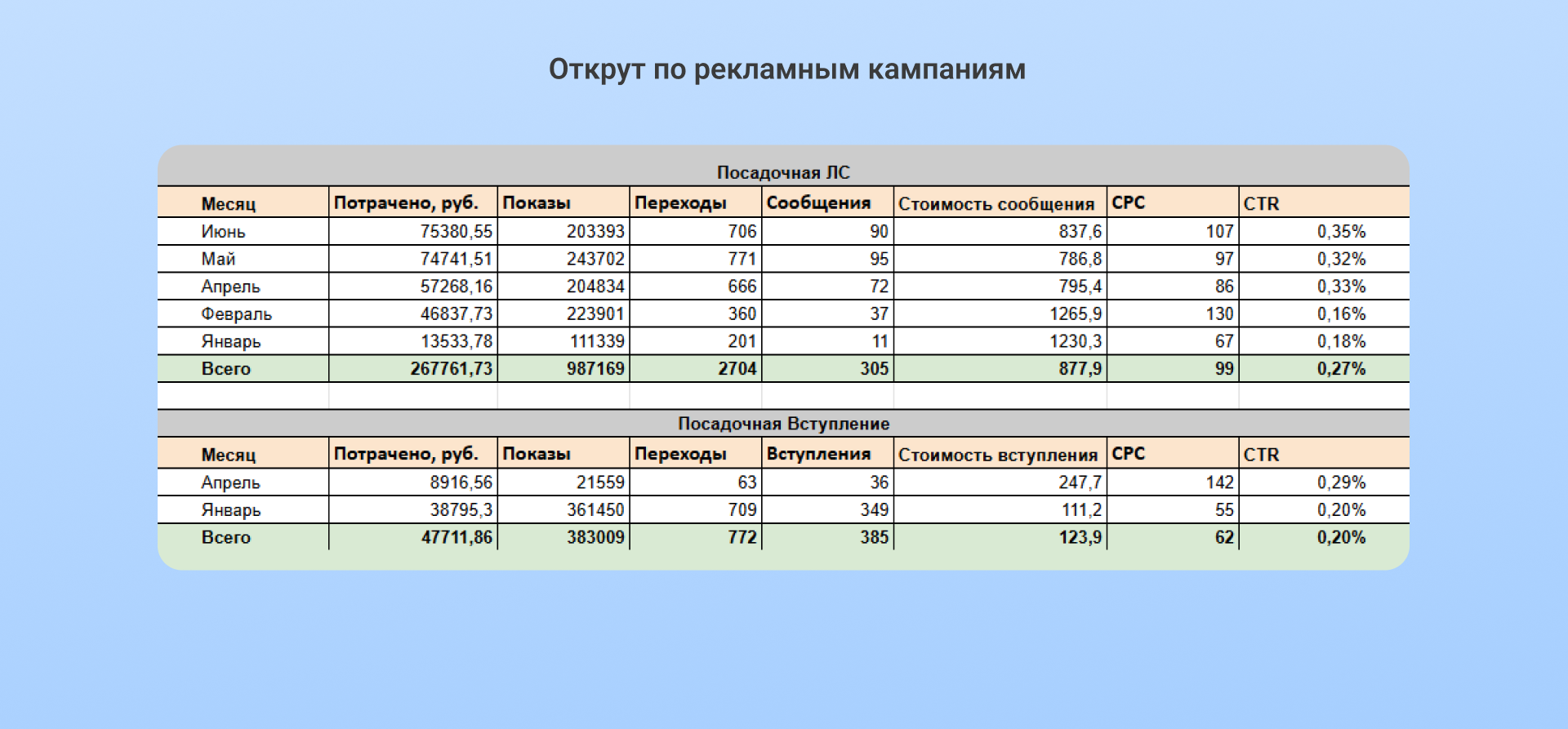 Основной вывод для полномасштабного запуска: делим продвижение на две площадки, в каждой откручиваем по одной цели.