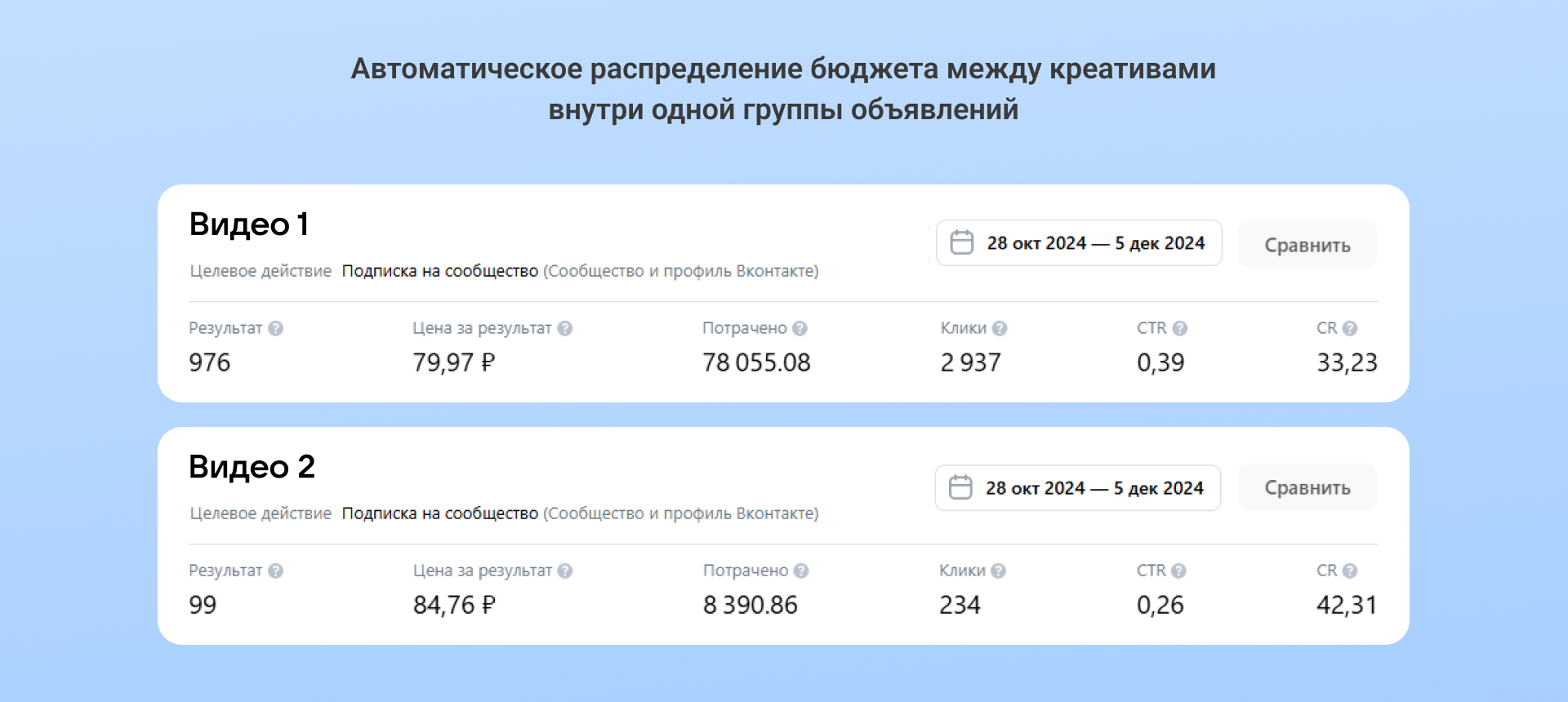 Алгоритмы VK ADS подтвердили наши действия. В одной группе одновременно запустили два креатива для самопроверки. Осознанно нарушили собственное правило «одна группа = одно объявление» — это позволило оценить эффективность каждого видео с точки зрения платформы. 90% бюджета автоматически распределилось на первый крео.