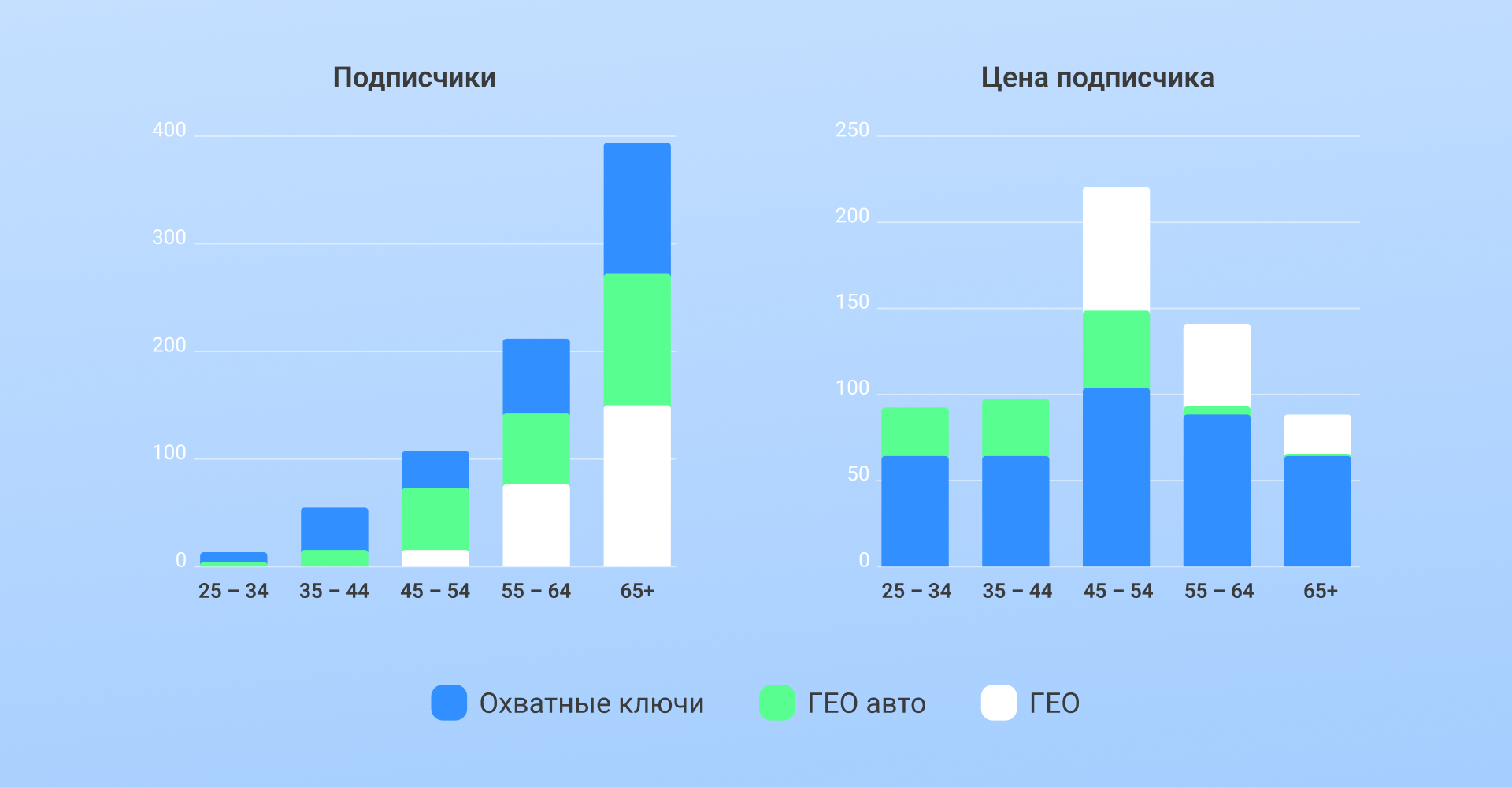 Второе наблюдение: чем старше аудитория, тем больше подписчиков и дешевле CPA. Даже в группе «ГЕО_авто», где демография определялась автоматически, закономерность соблюдалась.