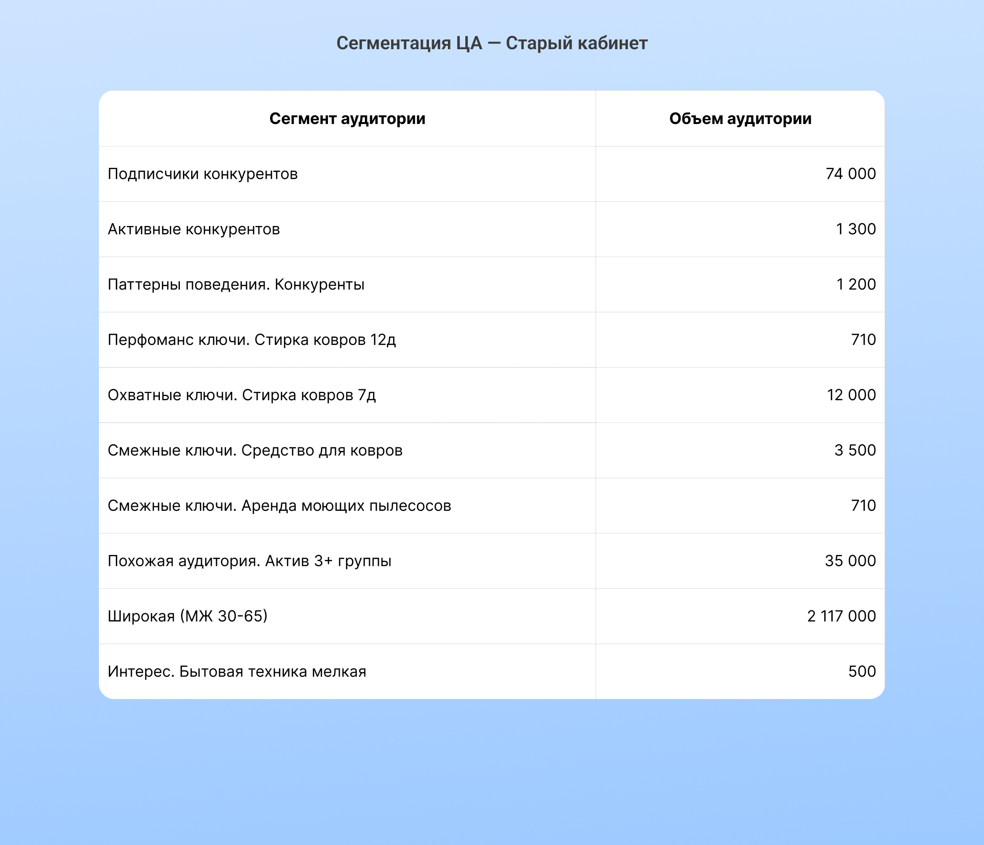 Согласовали перечень сегментов для нового и старого кабинетов. Большинство из них мы тестировали и отбирали наиболее перспективные. Неиспользованные сегменты были запасным вариантом на случай, если работающие аудитории себя исчерпают и понадобятся новые гипотезы.