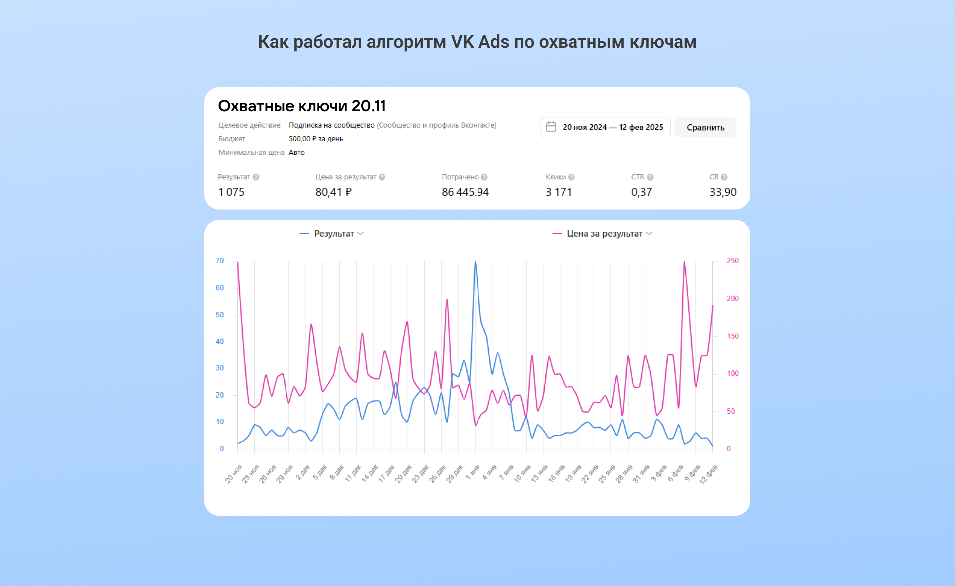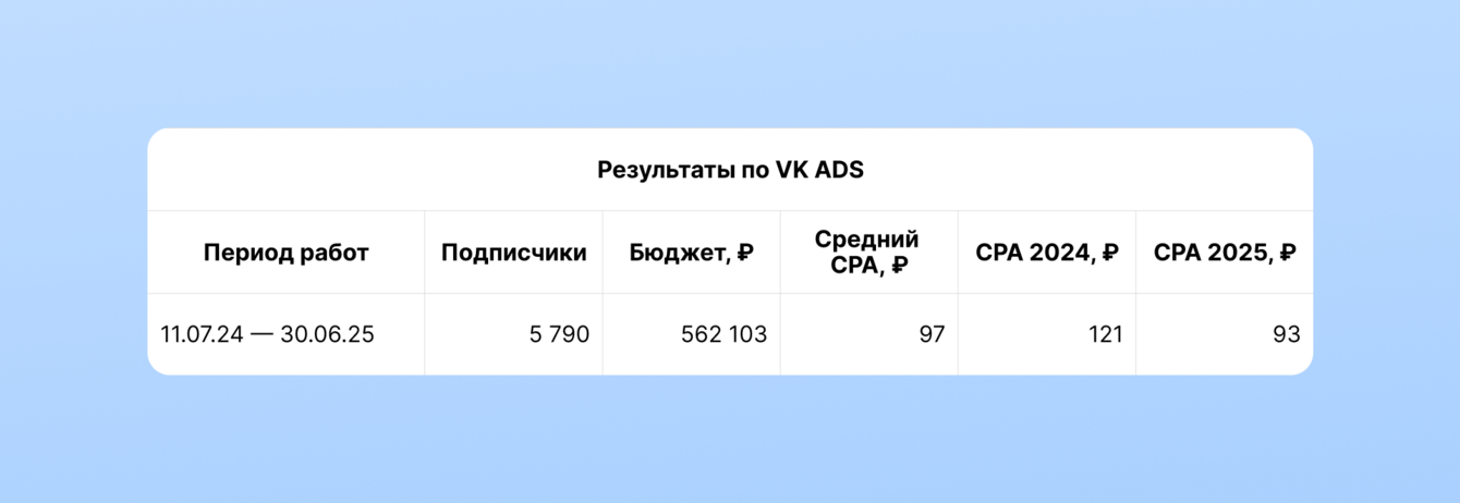 Цена подписчика 195 рублей в VK ADS была выше желаемой. Но клиент пришел к нам за работой вдолгую и знал, что со временем CPA будет снижаться. По этим причинам он согласился продолжать откручивать цель.