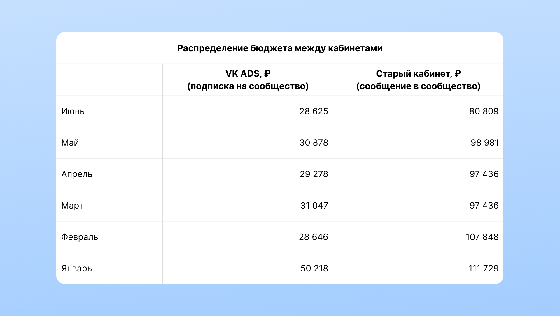 Соответственно, бюджет на старый кабинет был кратно больше, чем на VK ADS. За год продвижения он превысил 1 200 000 рублей.