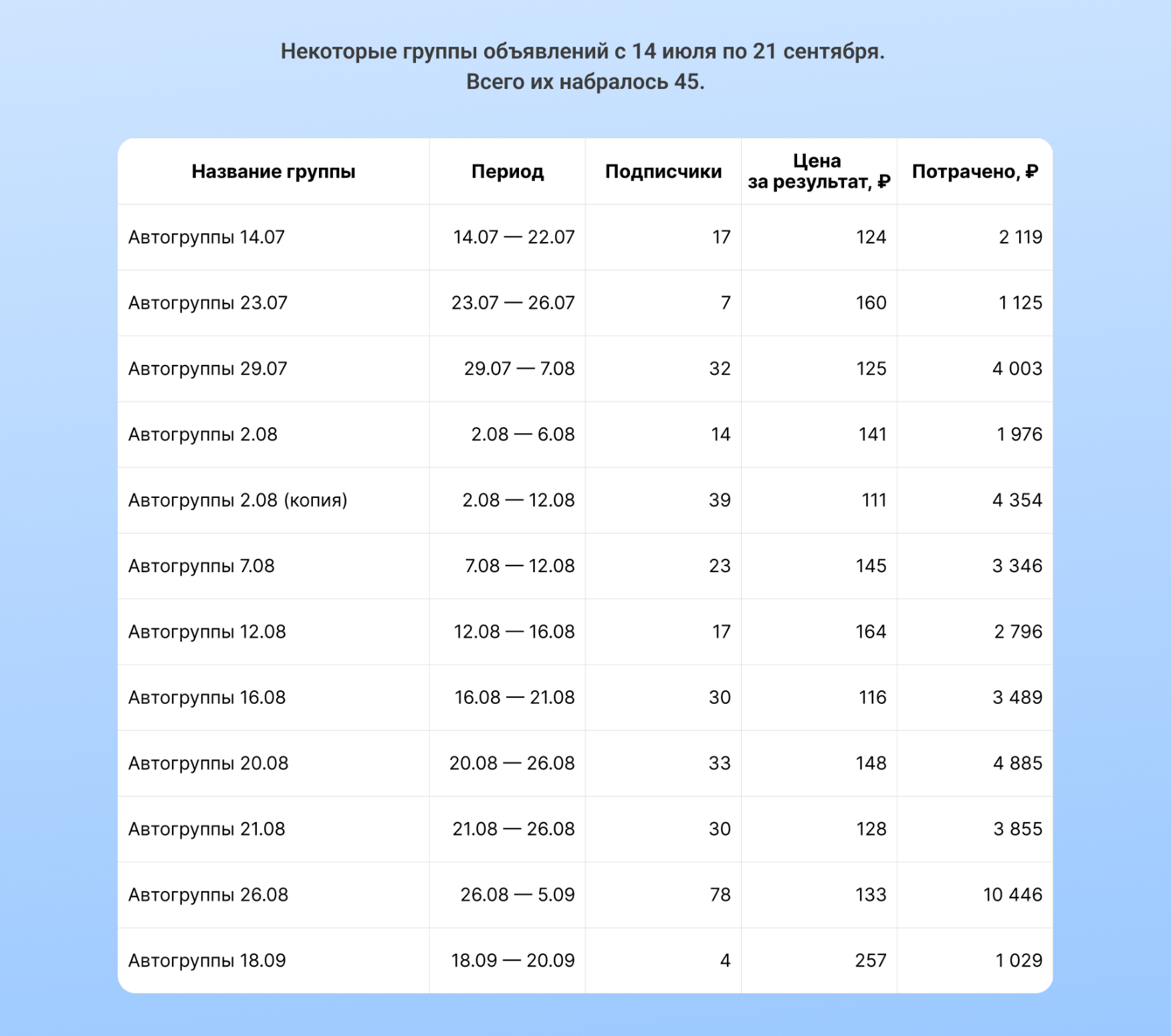 Полтора месяца РК находилась на плато. В лучших группах объявлений CPA «плавал» между 110-160 рублями. За это время в общей сумме набралось 45 копий «автогруппы». Как правило, они работали по 3-5 дней.