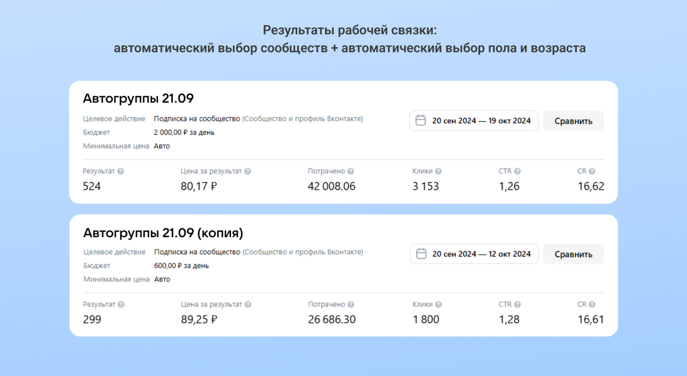 В нашем кейсе около десяти месяцев работали автоматические настройки: для подбора сообществ и демографии, а также для расширения аудитории. Как они поведут себя в вашей сфере — покажут только тесты.
