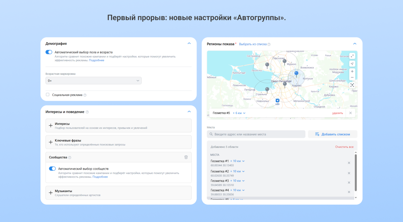 1. Изменили способ выставления региона показа: вместо выпадающего списка — геометки по СПб.