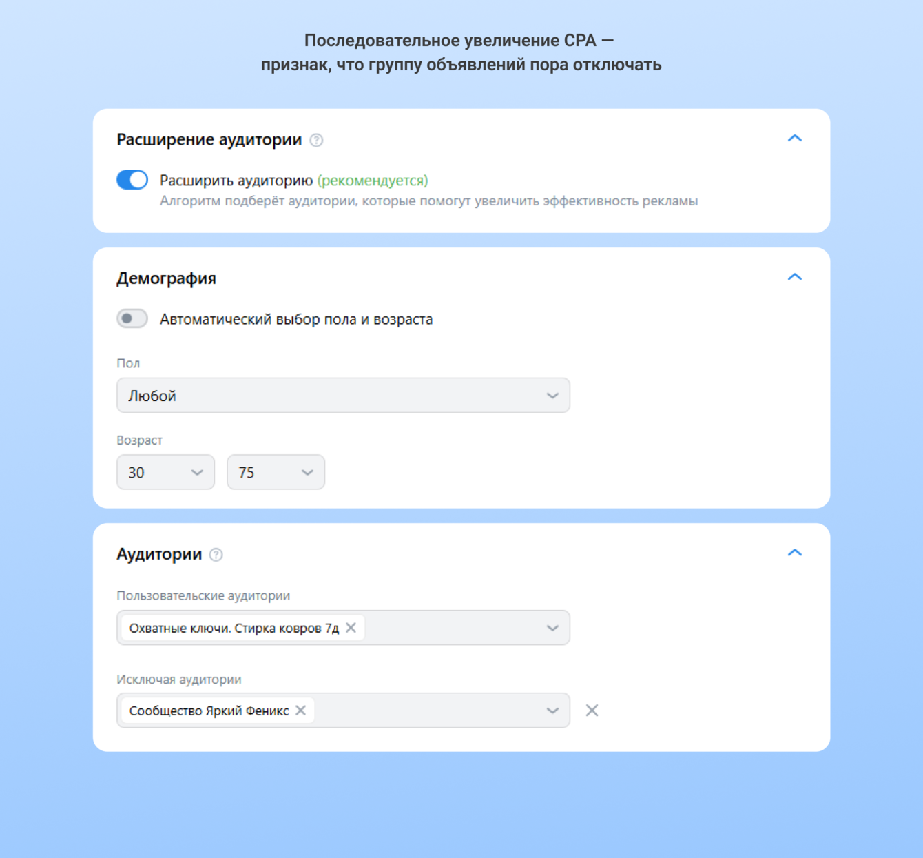 Настройки аудитории тоже совпадали. Со слов заказчика, ЦА — женщины от 25 до 55 лет, поэтому работу начали с ними. Разве что в одной группе выставили возраст от 30 до 65 лет — предположили, что старшее поколение проще заинтересовать стиркой ковров. Гипотеза расходилась с данными заказчика, потому что такой трафик мог оказаться некачественным.