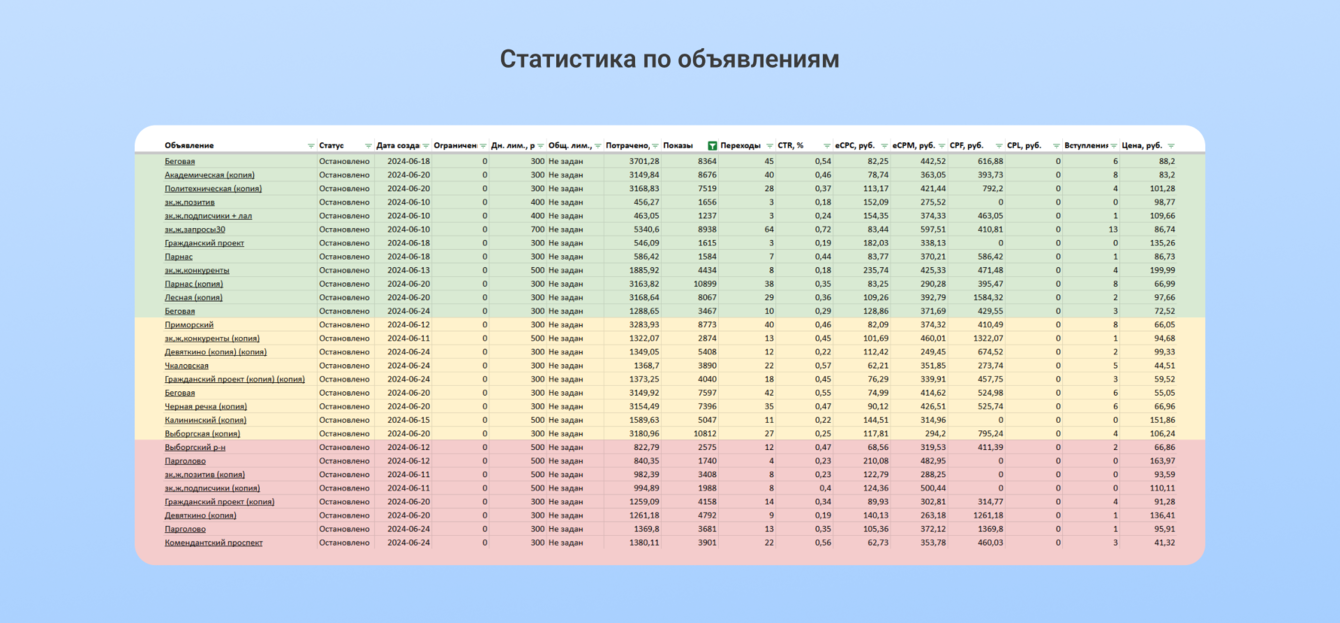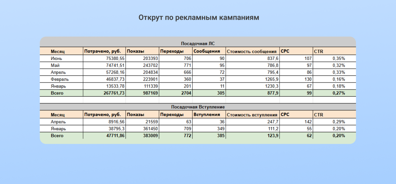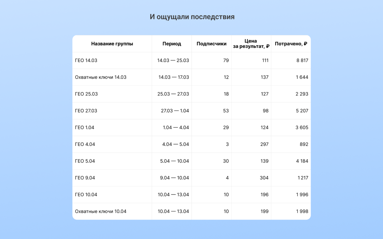 Забежим вперед. Подписку на рассылку продолжили тестировать, но в новом кабинете CPA вырос до 497 рублей. В конце концов от цели отказались. В будущем для нее отвели другой канал рекламы — посевы ВК, где результаты оказались более выгодными.