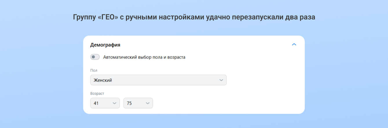 Решили потестировать ручные и автоматические настройки пола/возраста. В первом случае начали с возраста 51-75 лет — продолжали исследовать спрос на чистку ковров у старшего поколения.