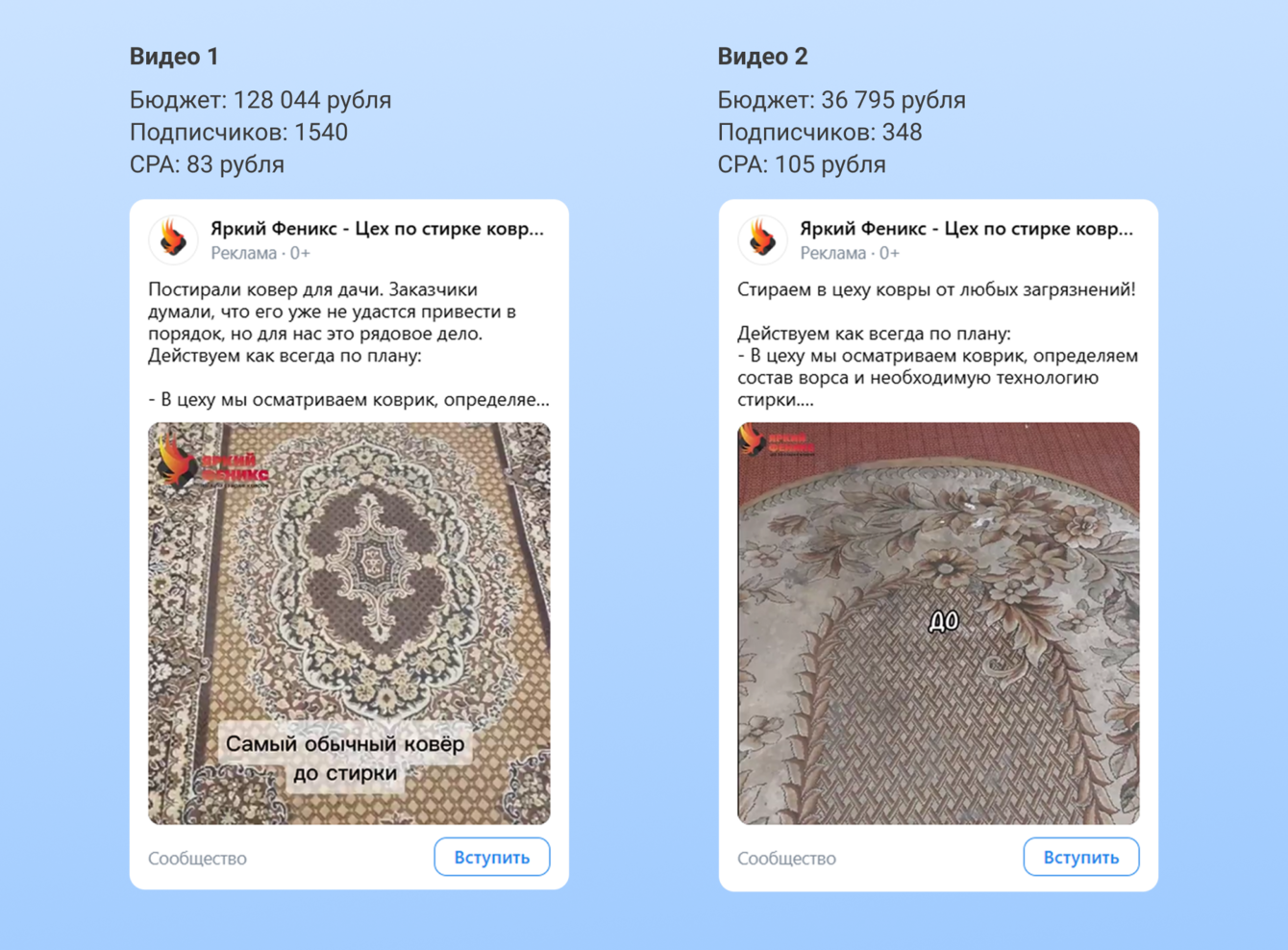 Тем не менее решили полностью отказаться от изображений в объявлениях из-за простой логики. Формат роликов лучше всего подходил нише: в нем есть возможность показать грязный ковер, как его чистили и результат. Кроме того, видео набирали популярность как тренд.