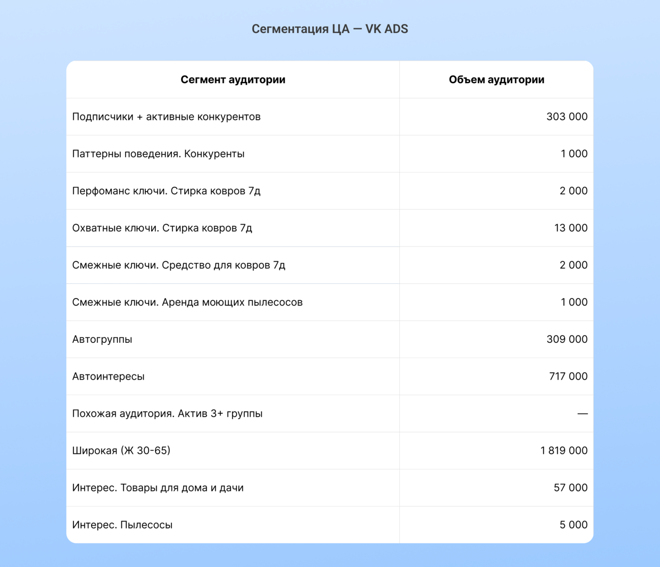 В дальнейшую работу взяли только «автогруппы» из-за объема аудитории: 309 тысяч человек против 13 тысяч у «охватных ключей».